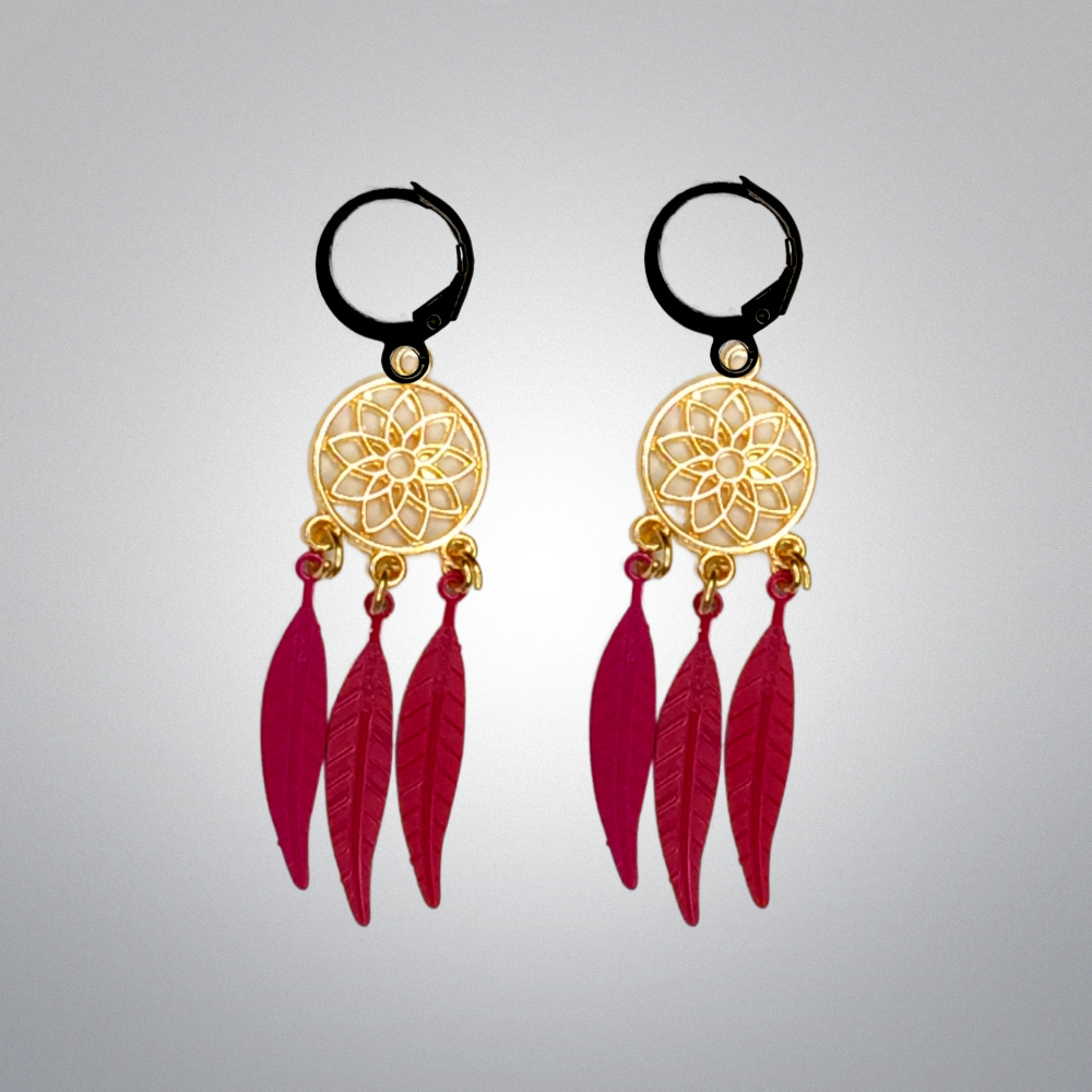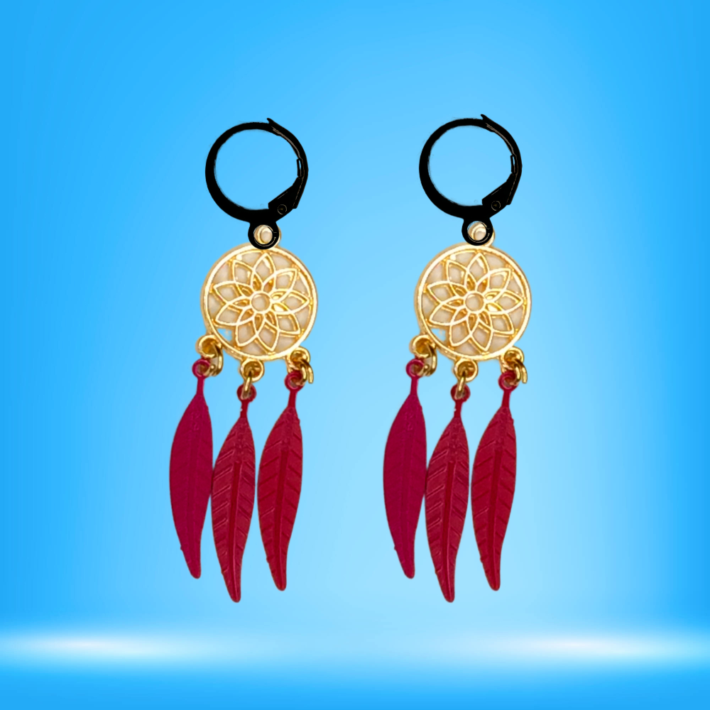 ******1 Par de Atrapasueños 30x15mm Color Dorado + Plumas Acero Color Rojo Intenso en Arracaditas Negras Acero 12x1mm Acero Alta Durabilidad *****