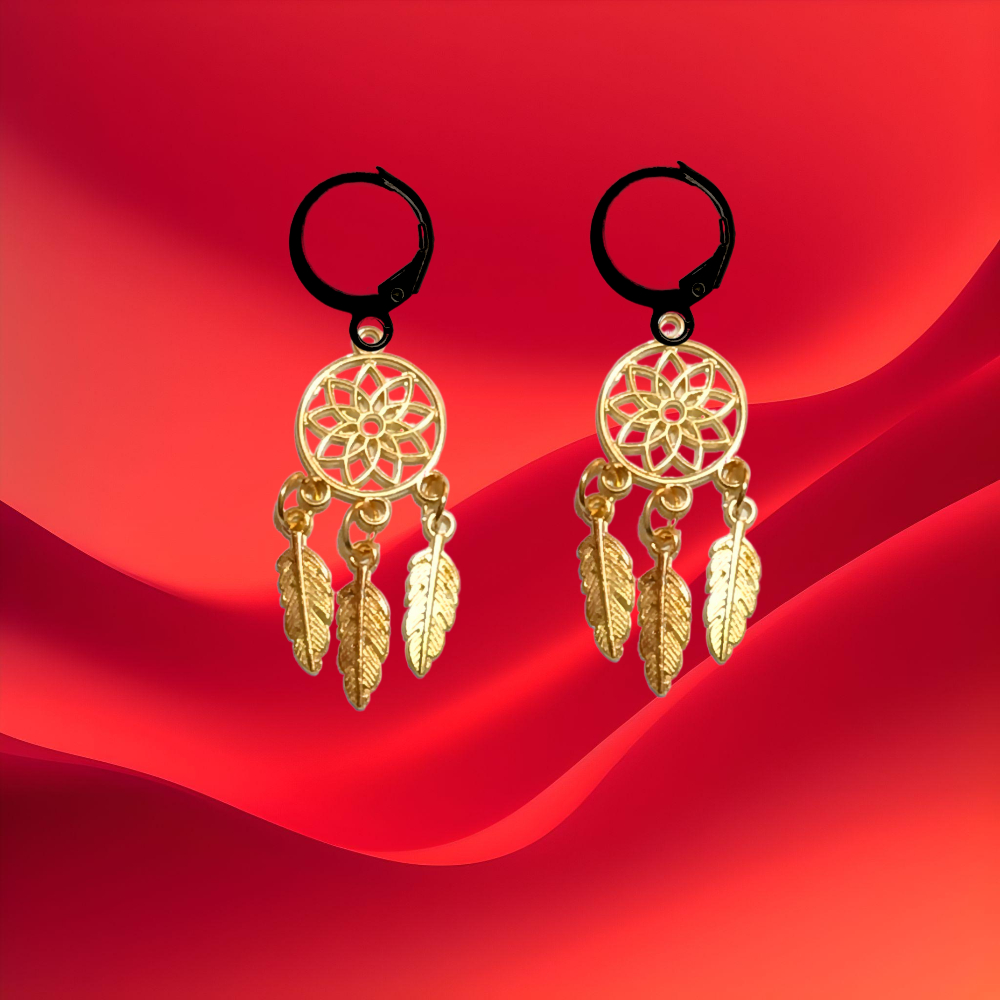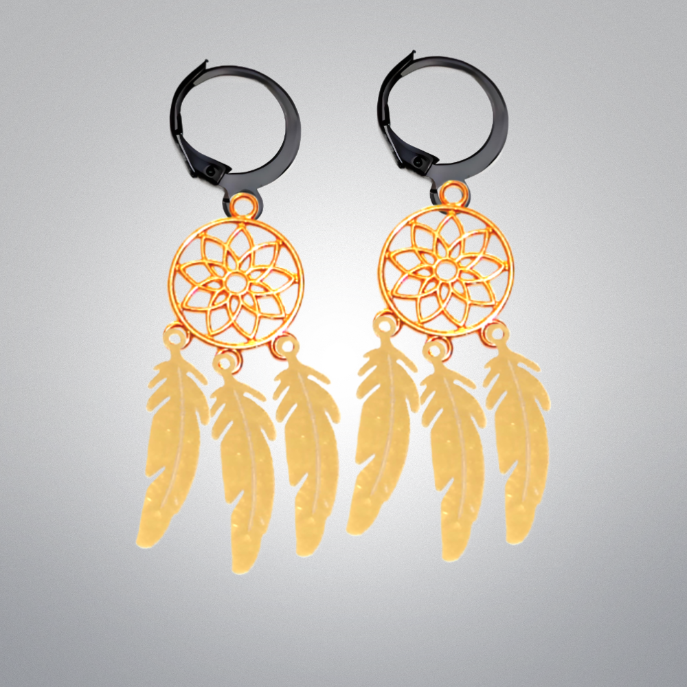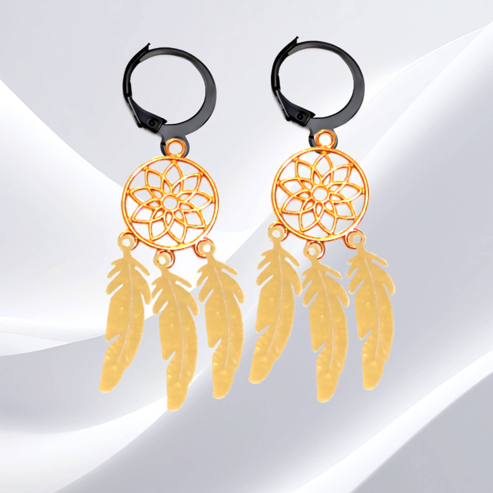 ******1 Par de Atrapasueños 30x15mm Color Dorado + Plumitas Chicas Color Dorado en Arracaditas Negras Acero 12x1mm Acero Alta Durabilidad *****