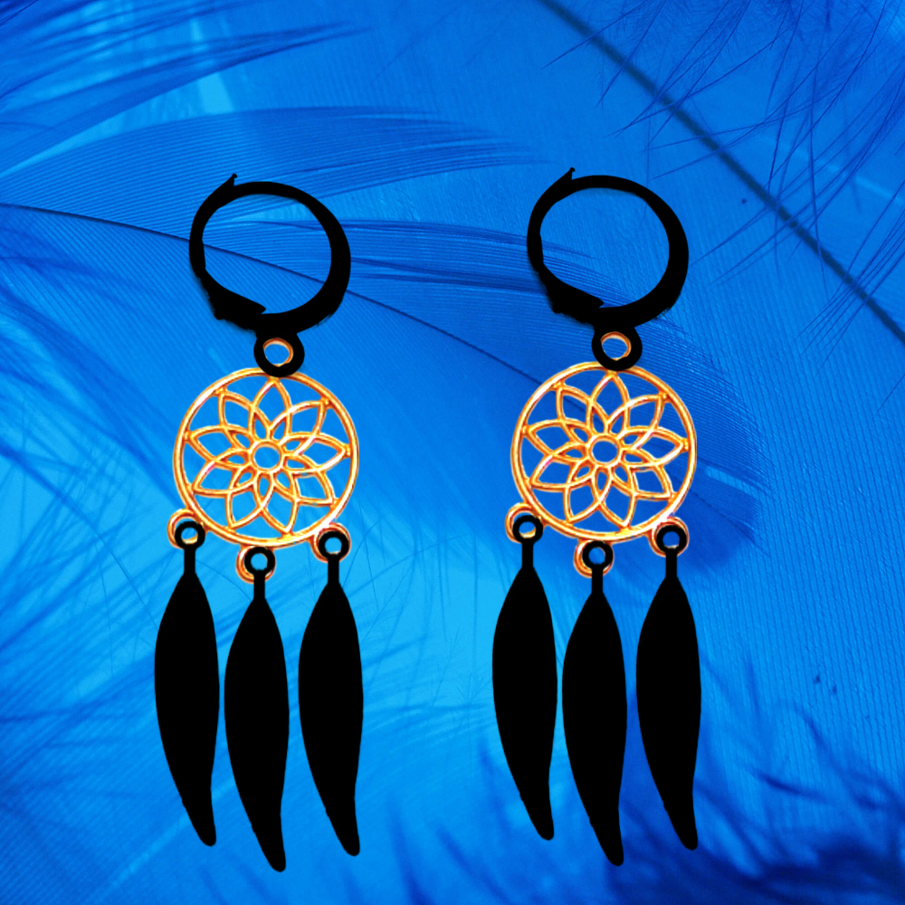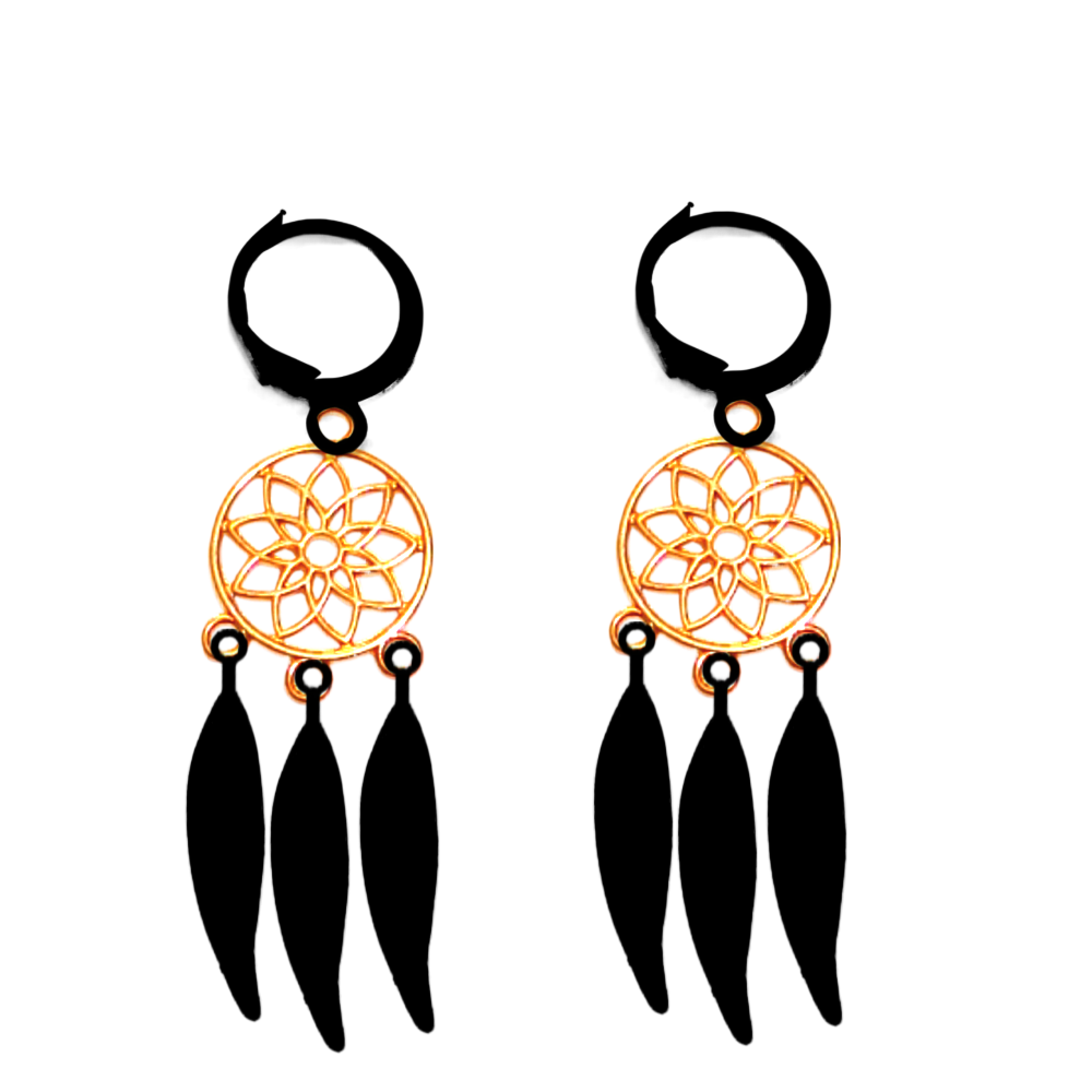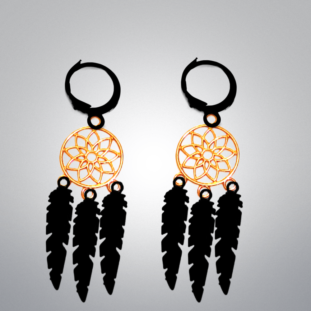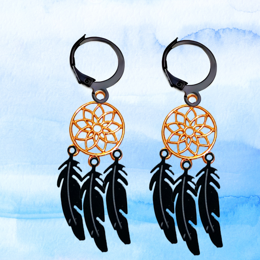 ******1 Par de Atrapasueños 30x15mm Color Dorado + Plumas Acero Color Negro en Arracaditas Negras Acero 12x1mm Acero Alta Durabilidad *****