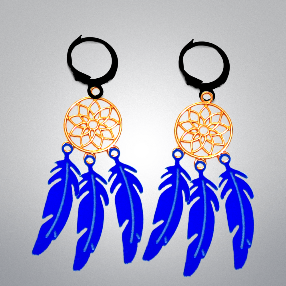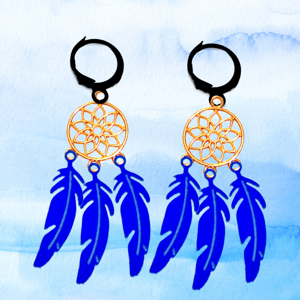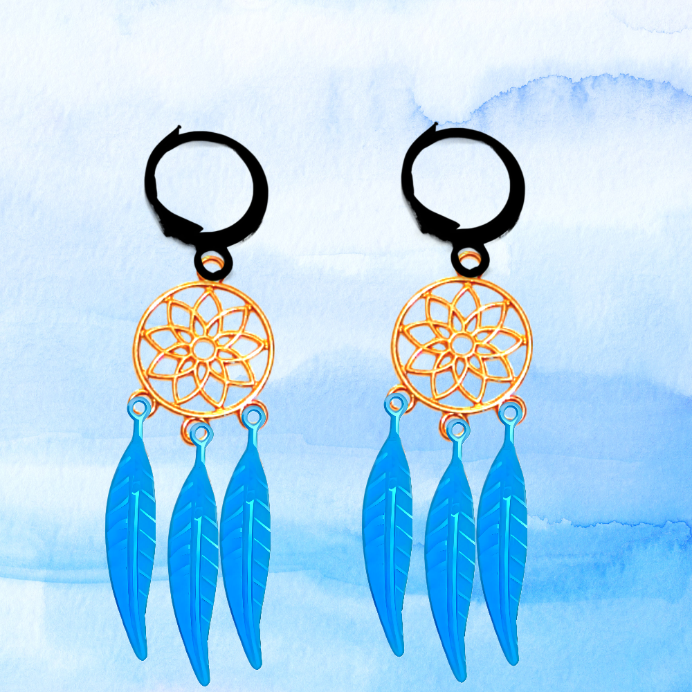 ******1 Par de Atrapasueños 30x15mm Color Dorado + Plumas Acero Color Azul en Arracaditas Negras Acero 12x1mm Acero Alta Durabilidad *****