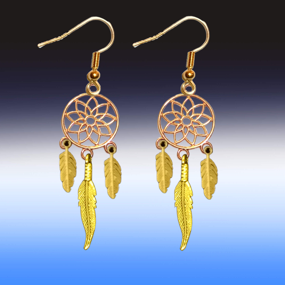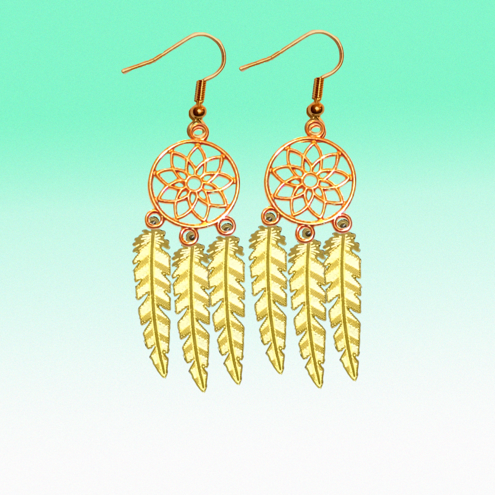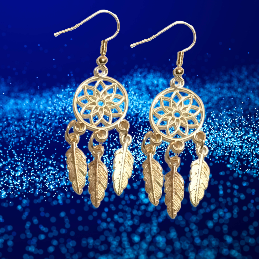 ******1 Par de Atrapasueños 30x15mm Color Dorado + Plumas Etnicas Medianas Color Dorado en Aretes Acero Inoxidable Alta Durabilidad *****