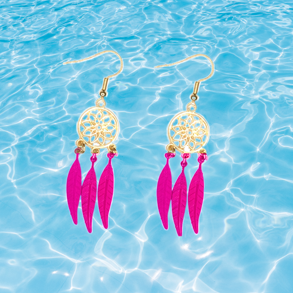 ******1 Par de Atrapasueños 30x15mm Color Dorado + Plumas Finas Color Rosa en Aretes Acero Inoxidable Alta Durabilidad *****