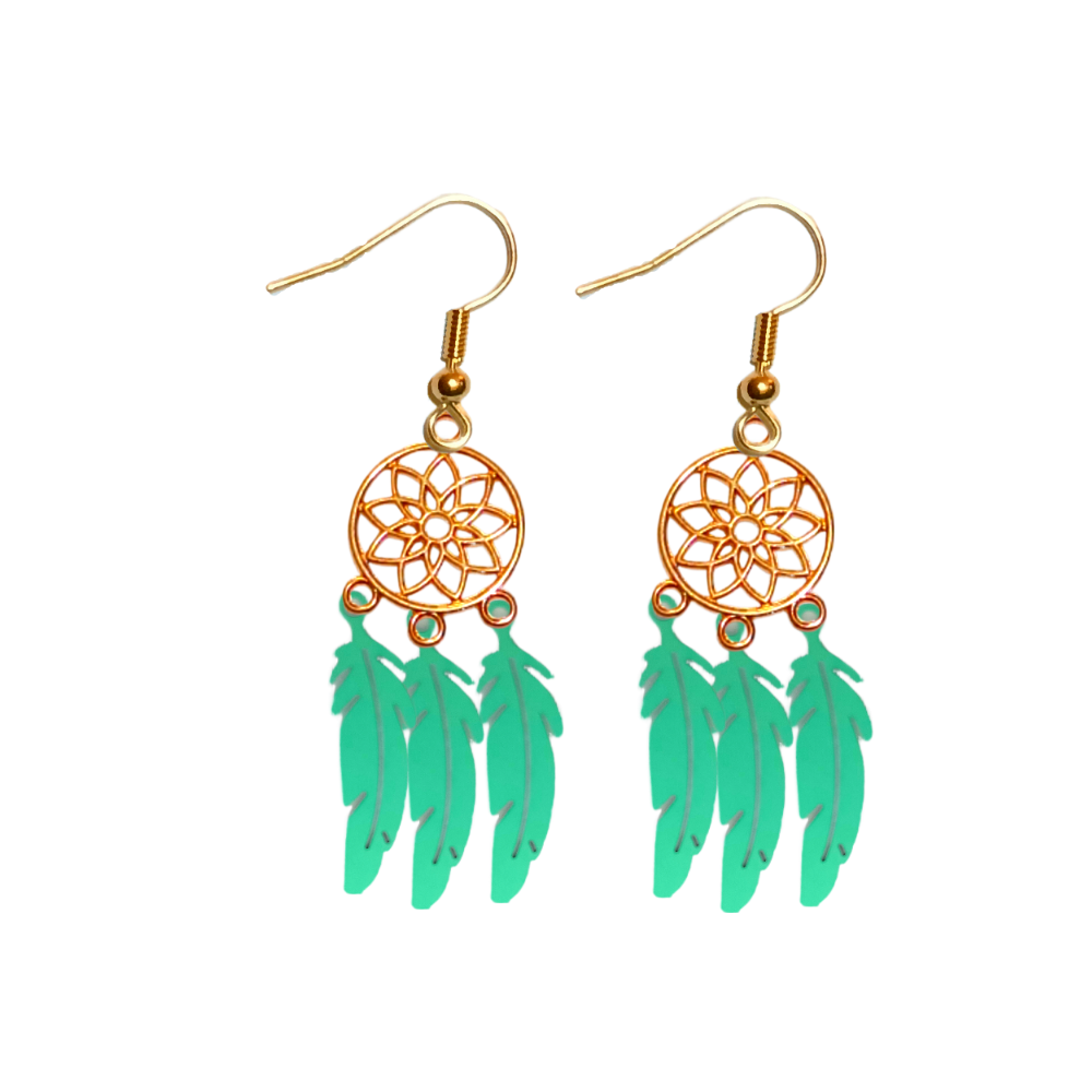 ******1 Par de Atrapasueños 30x15mm Color Dorado + Plumas Acero Color Verde en Aretes Acero Inoxidable Alta Durabilidad *****