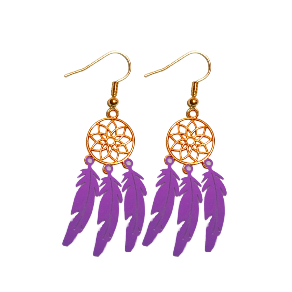 ******1 Par de Atrapasueños 30x15mm Color Dorado + Plumas Acero Color Morado en Aretes Acero Inoxidable Alta Durabilidad *****