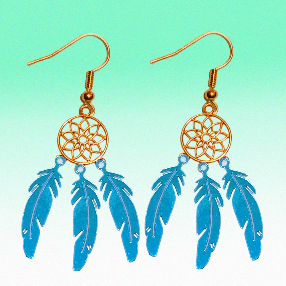 ******1 Par de Atrapasueños 30x15mm Color Dorado + Plumas Finas Color Azul en Aretes Acero Inoxidable Alta Durabilidad *****