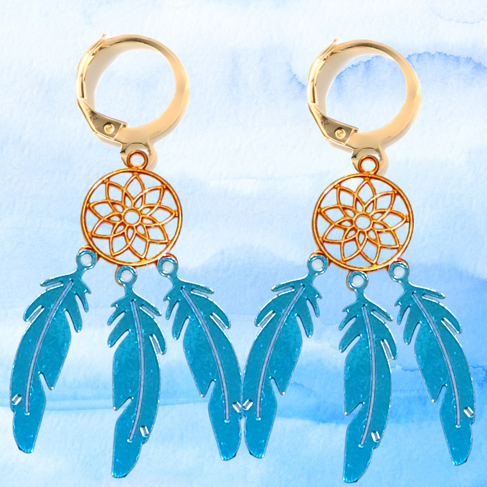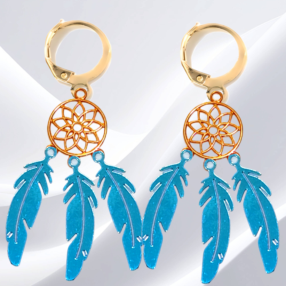 ******1 Par de Atrapasueños 30x15mm Color Dorado + Plumas Finas Color Azul en Arracaditas  Doradas Acero 12x1mm  Acero Alta Durabilidad  *****