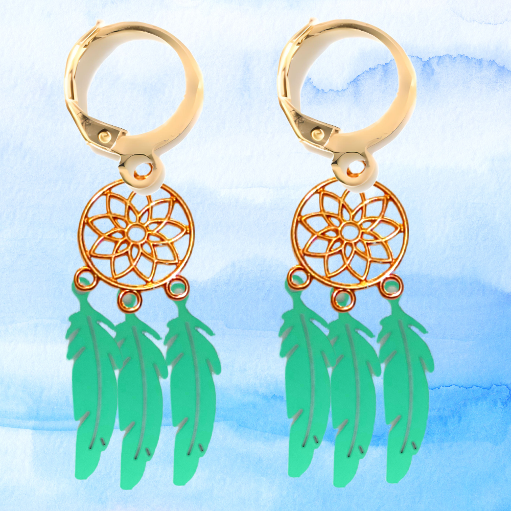 ******1 Par de Atrapasueños 30x15mm Color Dorado + Plumas Acero Color Verde en Arracaditas Doradas Acero 12x1mm  Acero Alta Durabilidad  *****