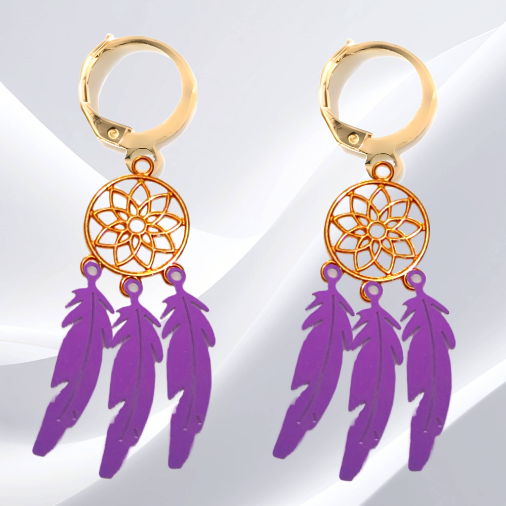 ******1 Par de Atrapasueños 30x15mm Color Dorado + Plumas Acero Color Morado en Arracaditas Doradas Acero 12x1mm  Acero Alta Durabilidad  *****