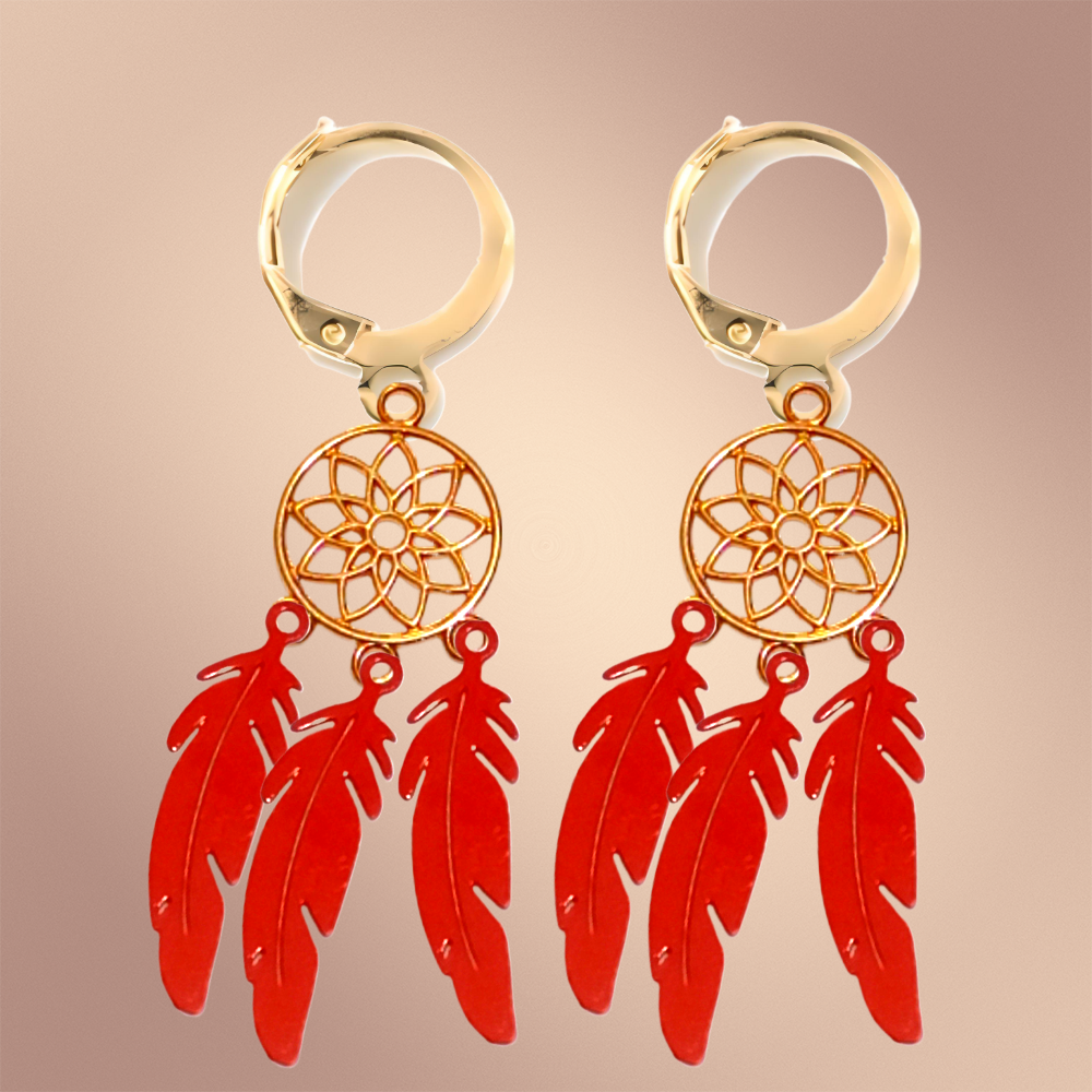 ******1 Par de Atrapasueños 30x15mm Color Dorado + Plumas Acero Color Rojo Intenso en Arracaditas Doradas Acero 12x1mm  Acero Alta Durabilidad  *****