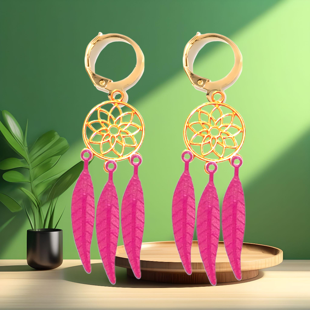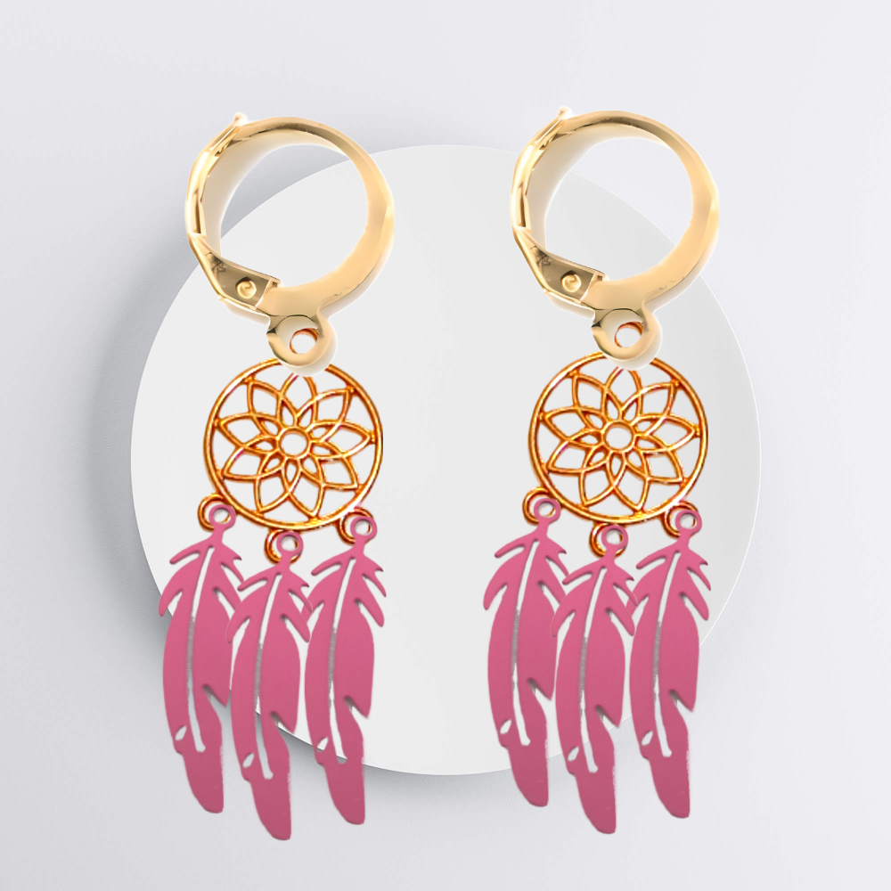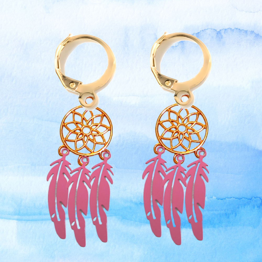 ******1 Par de Atrapasueños 30x15mm Color Dorado + Plumas Acero Color Rosa en Arracaditas Doradas Acero 12x1mm  Acero Alta Durabilidad  *****