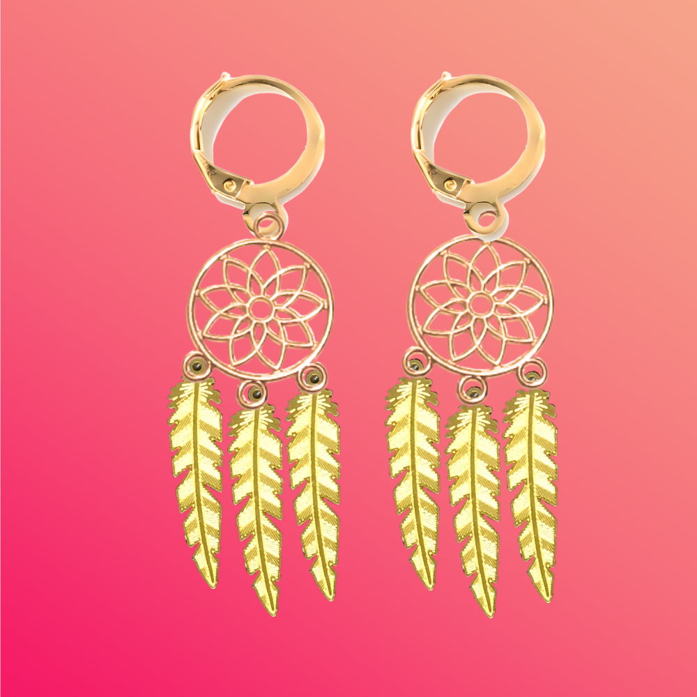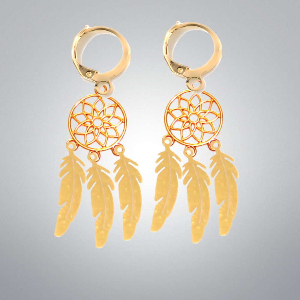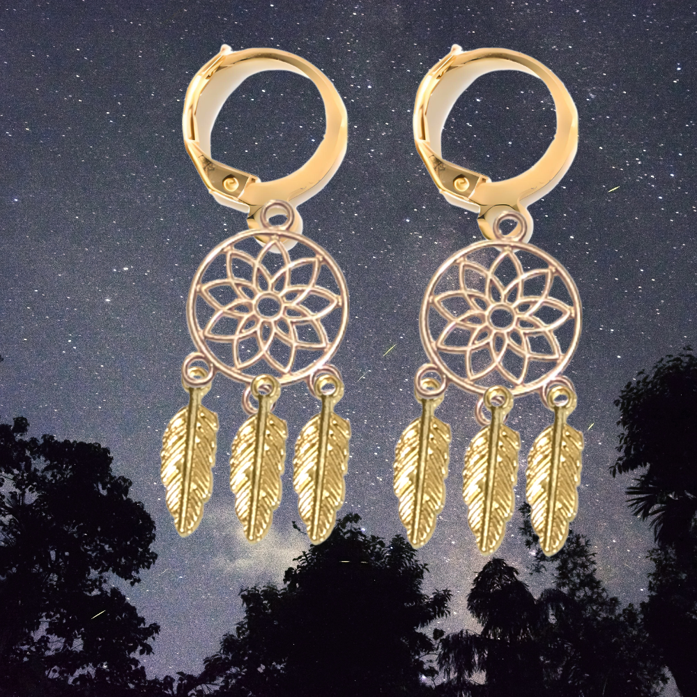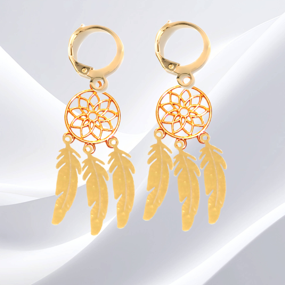 ******1 Par de Atrapasueños 30x15mm Color Dorado + Plumas Acero Color Dorado en Arracaditas Doradas Acero 12x1mm  Acero Alta Durabilidad  *****