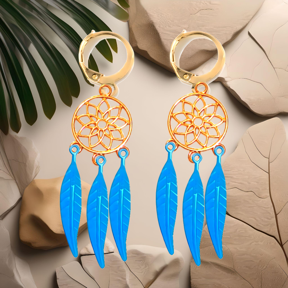 ******1 Par de Atrapasueños 30x15mm Color Dorado + Plumas Acero Color Azul en Arracaditas Doradas Acero 12x1mm  Acero Alta Durabilidad  *****