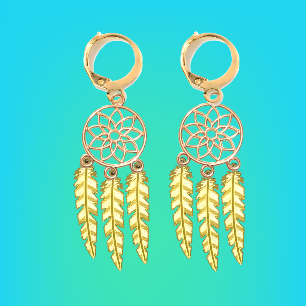 ******1 Par de Atrapasueños 30x15mm Color Dorado + Plumitas Chicas Color Dorado en Arracaditas  Doradas Acero 12x1mm  Acero Alta Durabilidad  *****