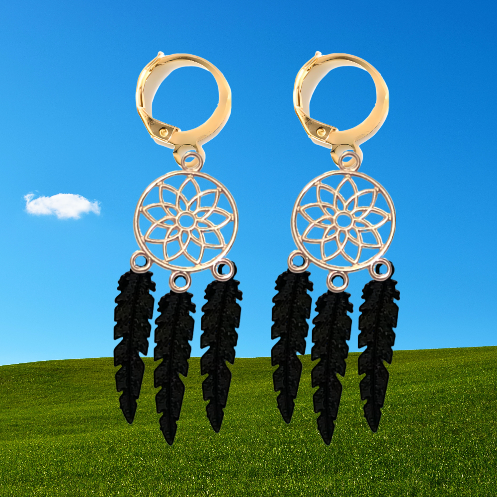 ****** 1 Par de Atrapasueños 30x15mm Color Plata + Plumas Medianas Etnicas Color Negro Arracaditas Doradas Acero 12x1mm  Acero Alta Durabilidad  *****
