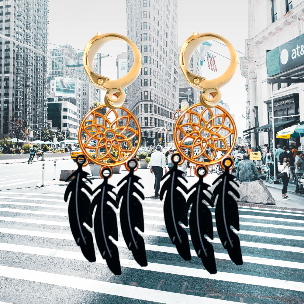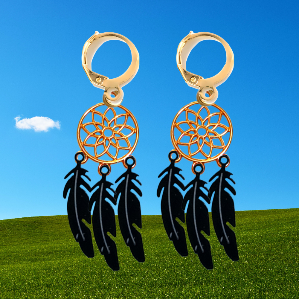 ******1 Par de Atrapasueños 30x15mm Color Dorado + Plumas Acero Color Negro en Arracaditas Doradas Acero 12x1mm  Acero Alta Durabilidad  *****