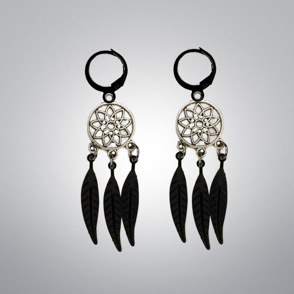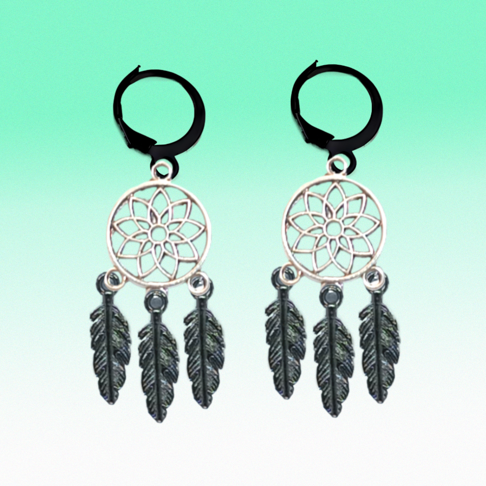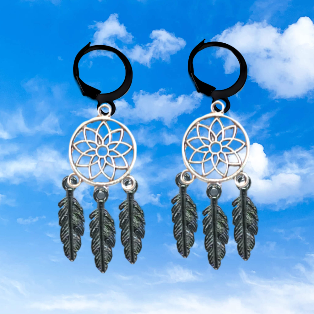 ******1 Par de Atrapasueños 30x15mm Color Plata + Plumas Acero Color Negro en Arracaditas Negras Acero 12x1mm  Acero Alta Durabilidad  *****