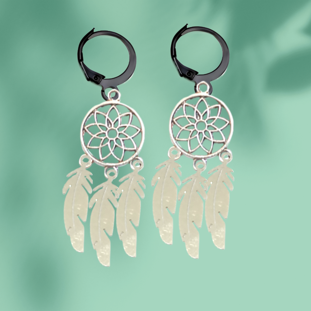 ******1 Par de Atrapasueños 30x15mm Color Plata + 2 Plumitas Cortas y 1 Pluma Larga Etnica  Color Plata en Arracaditas Negras Acero 12x1mm Acero Alta Durabilidad  *****