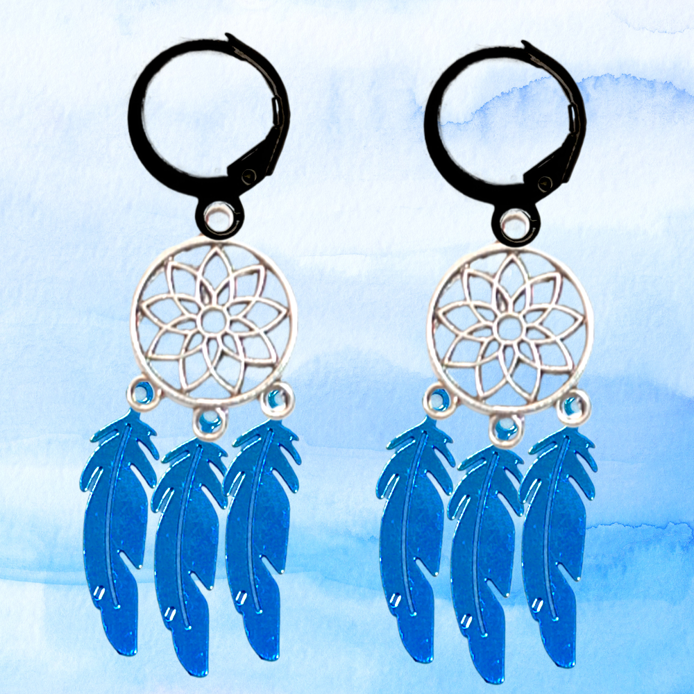 ******1 Par de Atrapasueños 30x15mm Color Plata + Plumas Acero Color Azul en Arracaditas Negras Acero 12x1mm  Acero Alta Durabilidad  *****