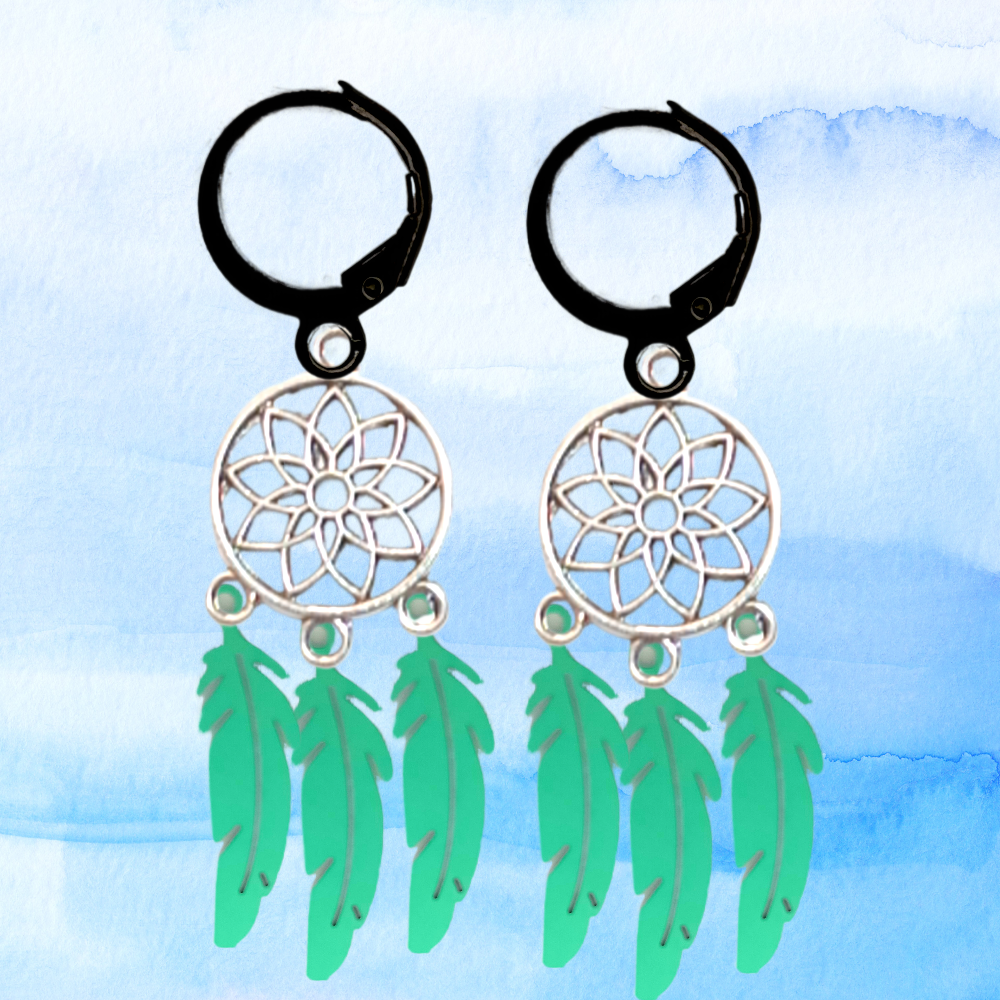 ******1 Par de Atrapasueños 30x15mm Color Plata + Plumas Acero Color Verde en Arracaditas Negras Acero 12x1mm  Acero Alta Durabilidad  *****