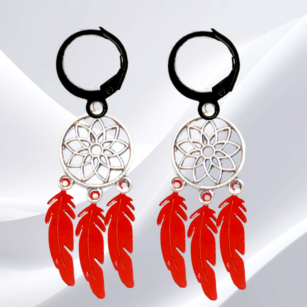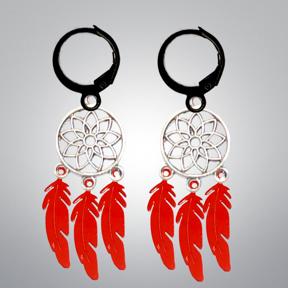 ******1 Par de Atrapasueños 30x15mm Color Plata + Plumas Acero Color Rojo Intenso en Arracaditas Negras Acero 12x1mm  Acero Alta Durabilidad  *****
