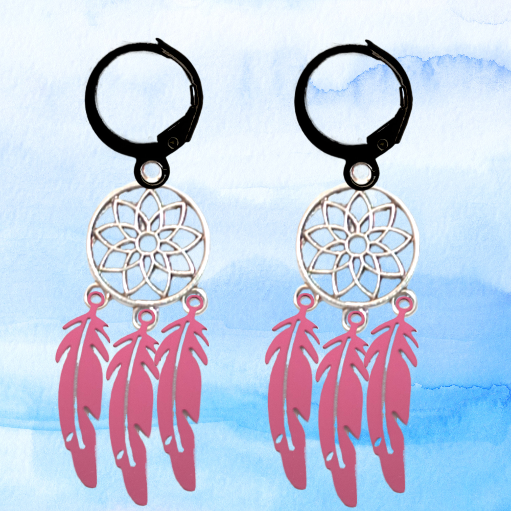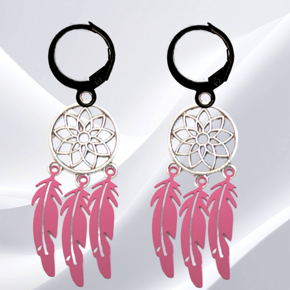 ******1 Par de Atrapasueños 30x15mm Color Plata + Plumas Acero Color Rosa en Arracaditas Negras Acero 12x1mm  Acero Alta Durabilidad  *****