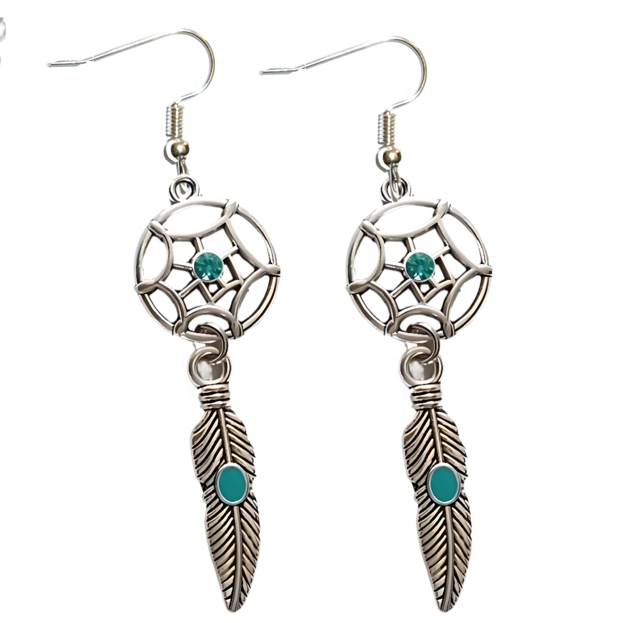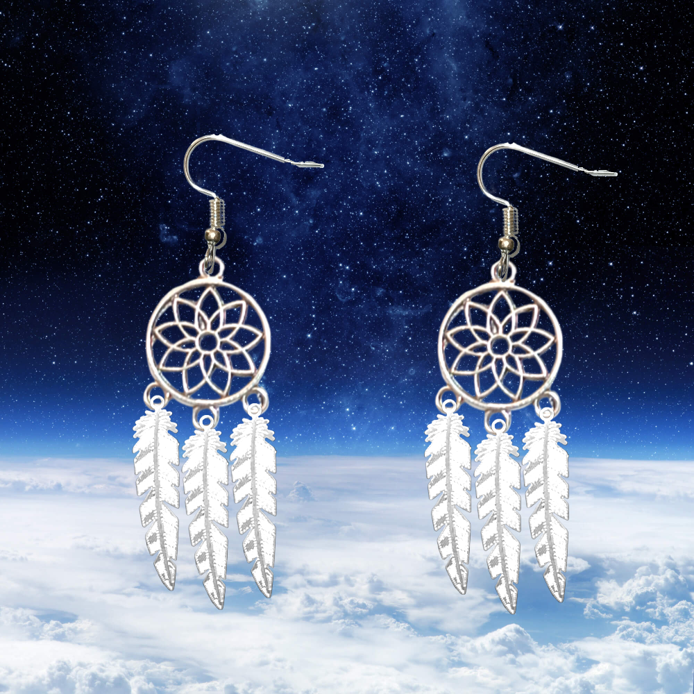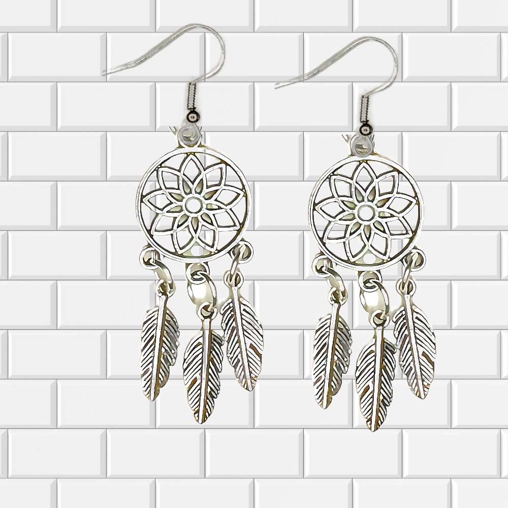 ******1 Par de Atrapasueños 30x15mm Color Plata + Plumas Etnicas Medianas Color Plata en Aretes Acero Inoxidable Alta Durabilidad *****