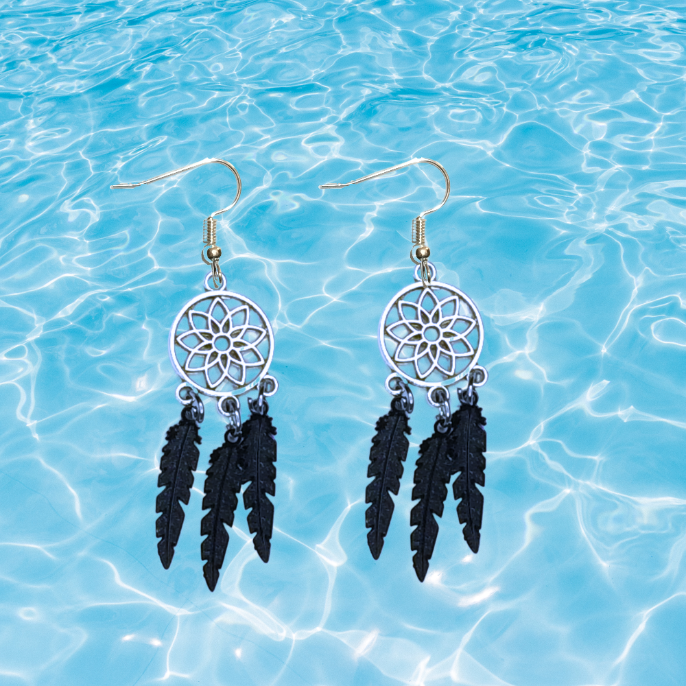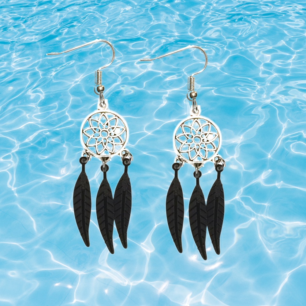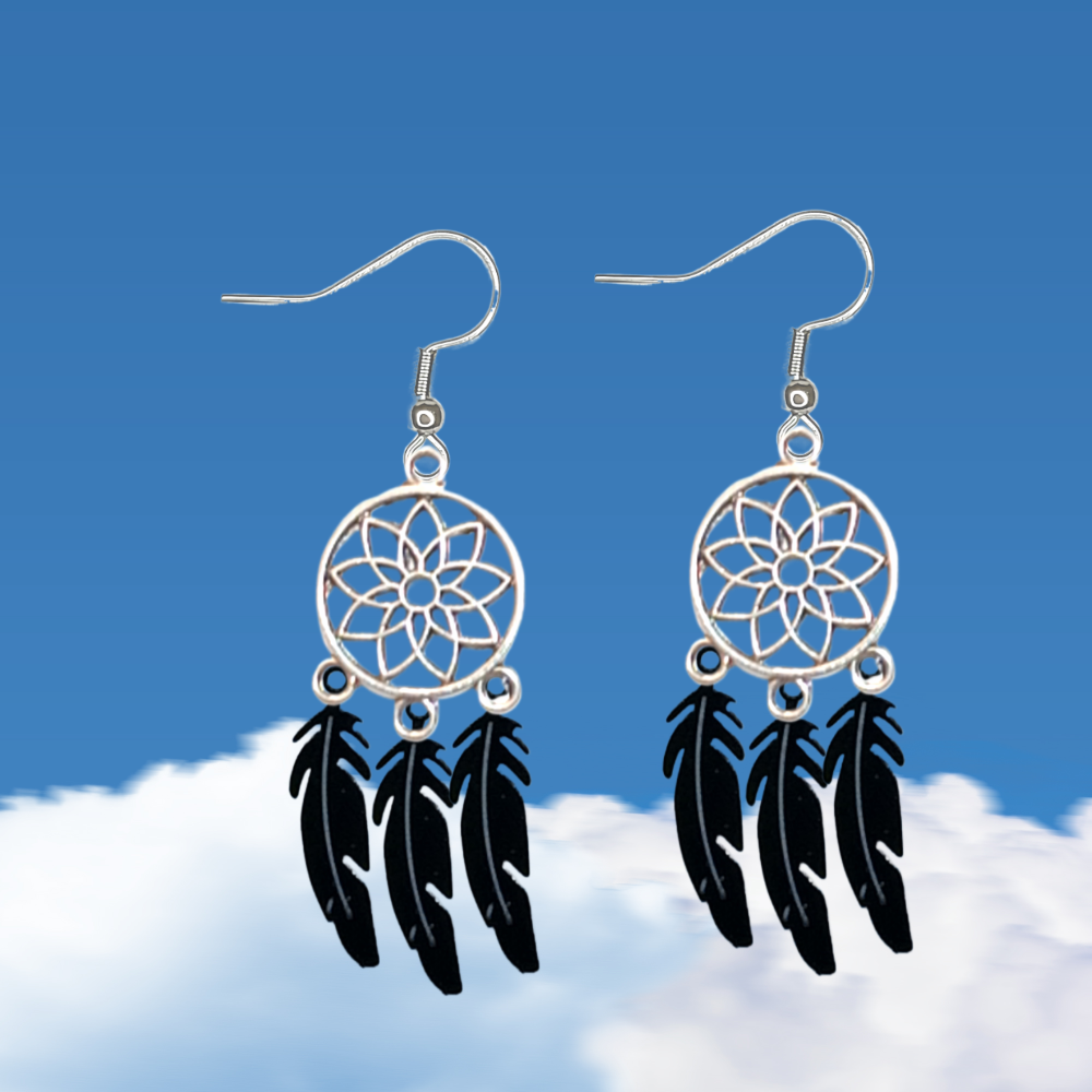 ******1 Par de Atrapasueños 30x15mm Color Plata + Plumas Etnicas Medianas Color Negro en Aretes Acero Inoxidable Alta Durabilidad *****
