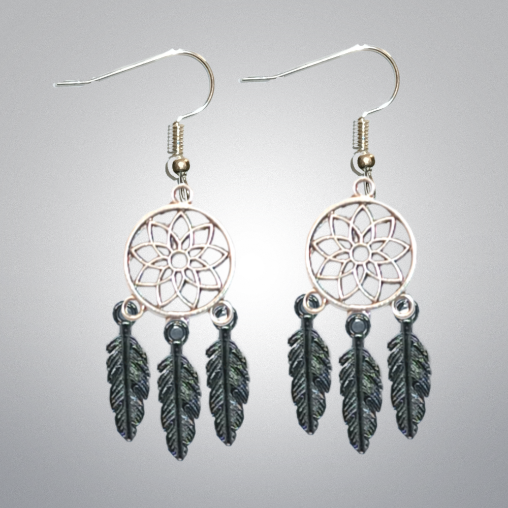 ******1 Par de Atrapasueños 30x15mm Color Plata + 2 Plumitas Cortas y 1 Pluma Larga Etnica Color Gris Oxford en Aretes Acero Inoxidable Alta Durabilidad *****