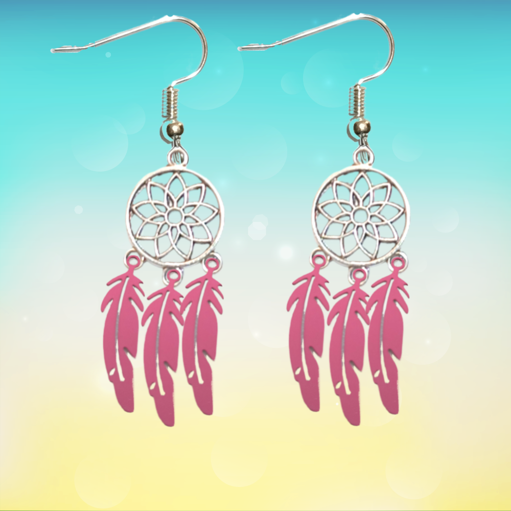 ******1 Par de Atrapasueños 30x15mm Color Plata + Plumas Finas Color Rosa en Aretes Acero Inoxidable Alta Durabilidad *****