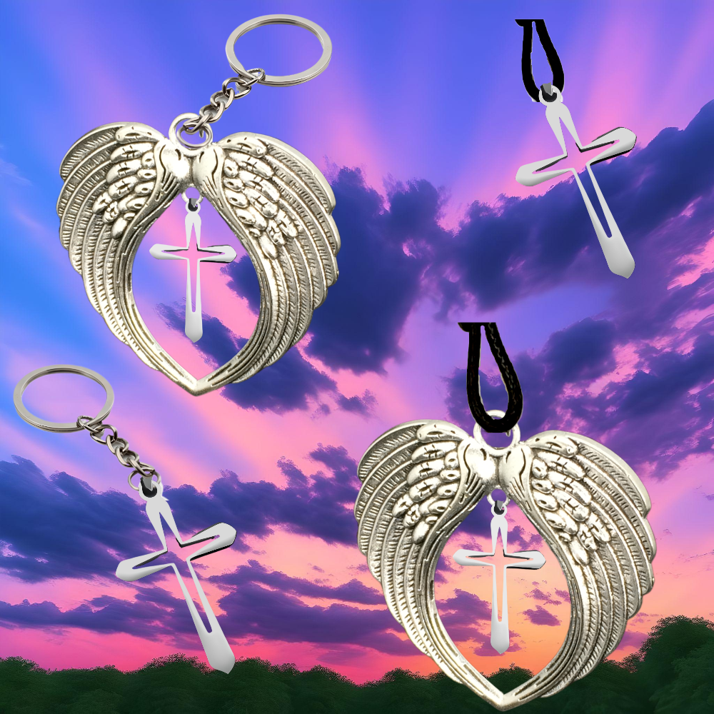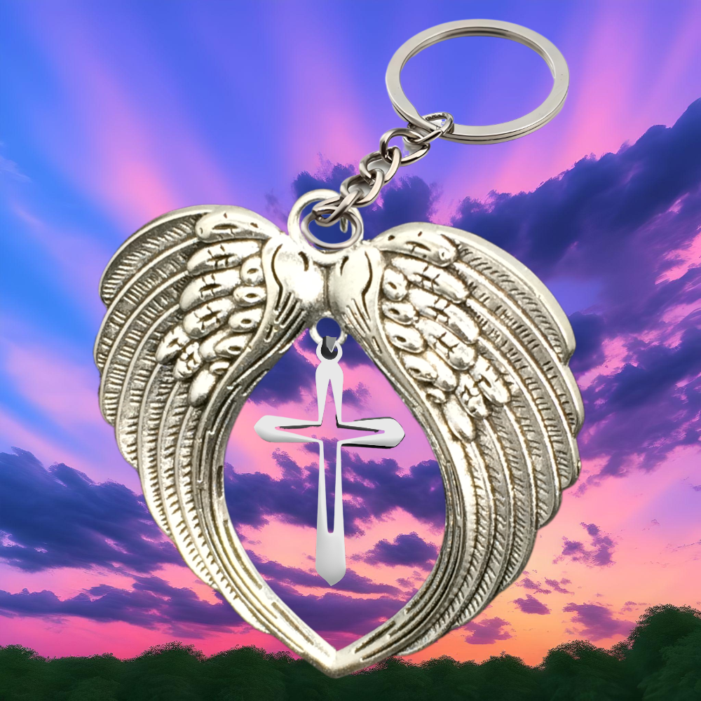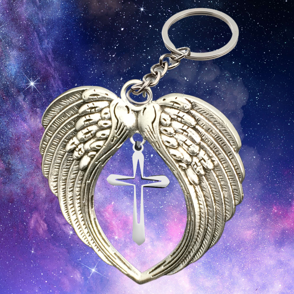 1 Dije en Llavero de Cruz Para Recibir Justicia Divina Activada 45x25mm ACERO INOXIDABLE En Alas de Angel 80x60mm ALTA DURABILIDAD
