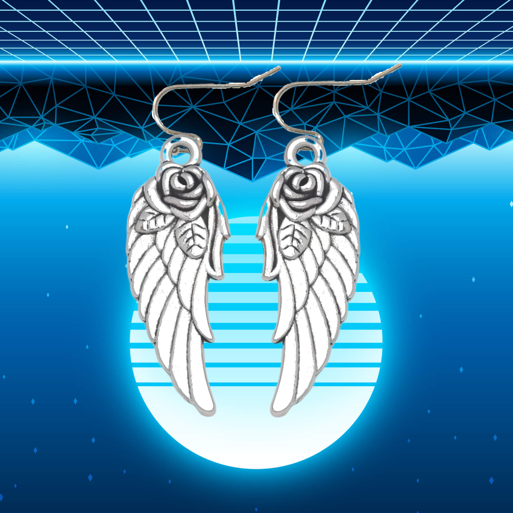 1 Par de Aretes Con Alas de Angel Medianas con Rosa color plata Color Plata 31X11mm