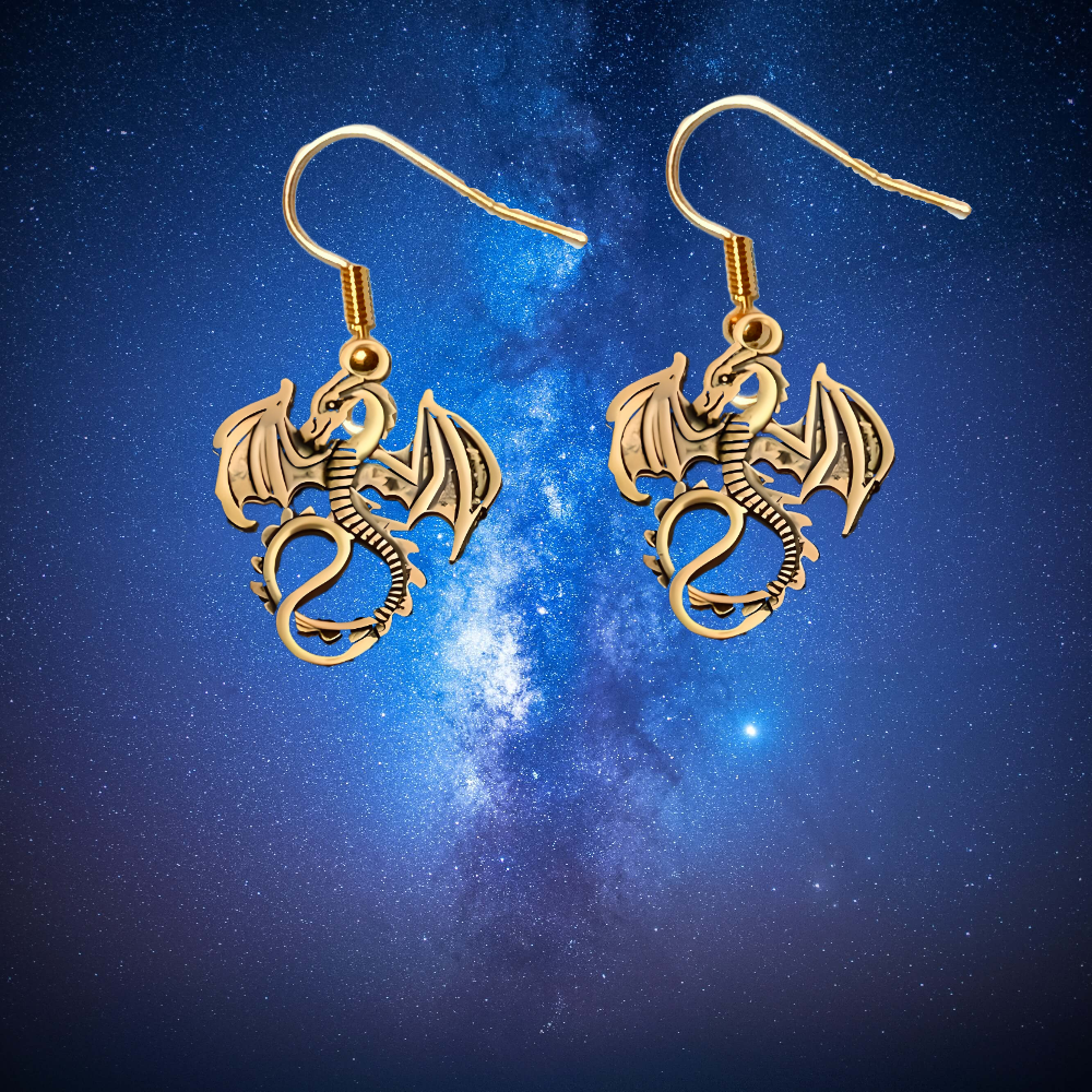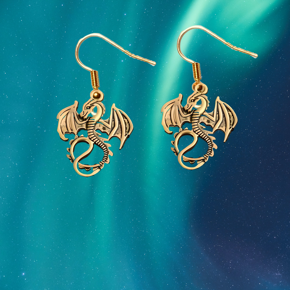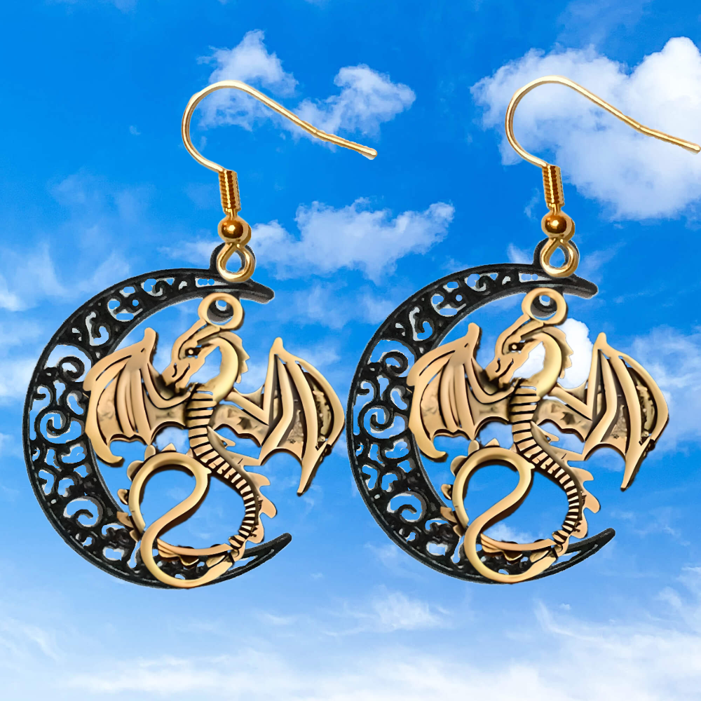 2 Dijes Dragón Vikingo Grande Color Dorado 30x30mm en Luna Color Negr de Alta Durabilidad En Aretes