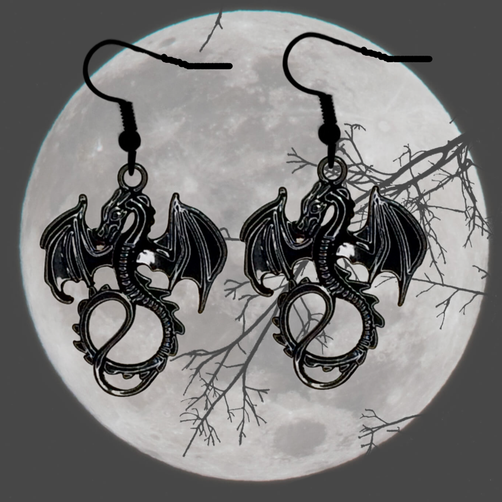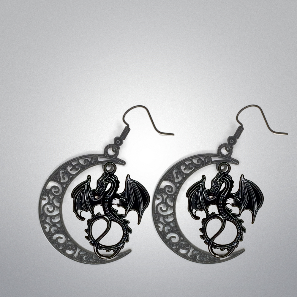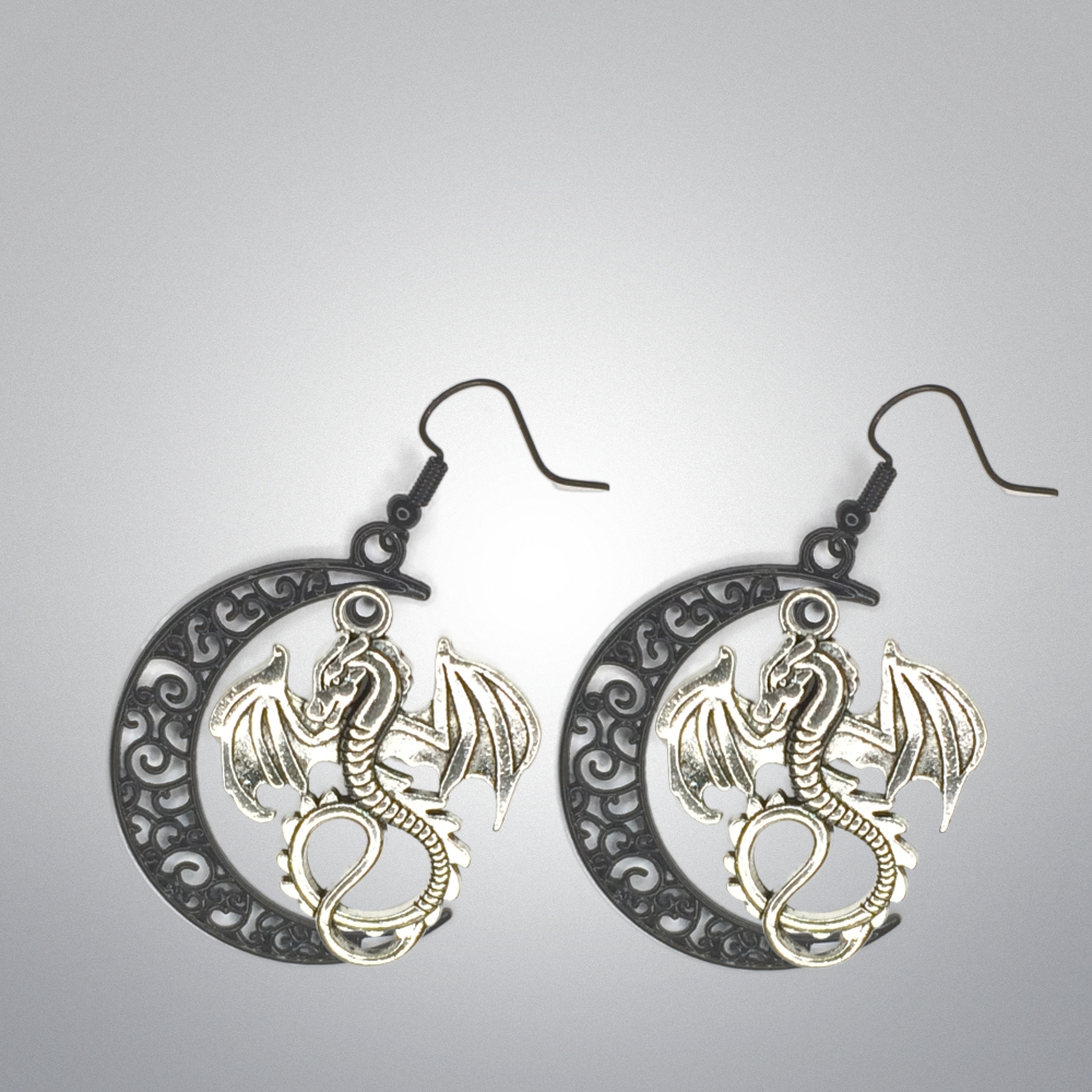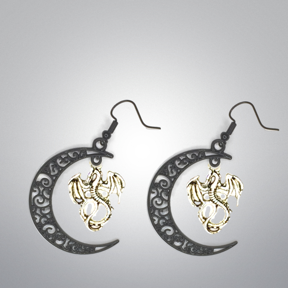 2 Dijes Dragon Vikingo Grande Color Negr 30x30mm en Luna Color Negr de Alta Durabilidad En Aretes