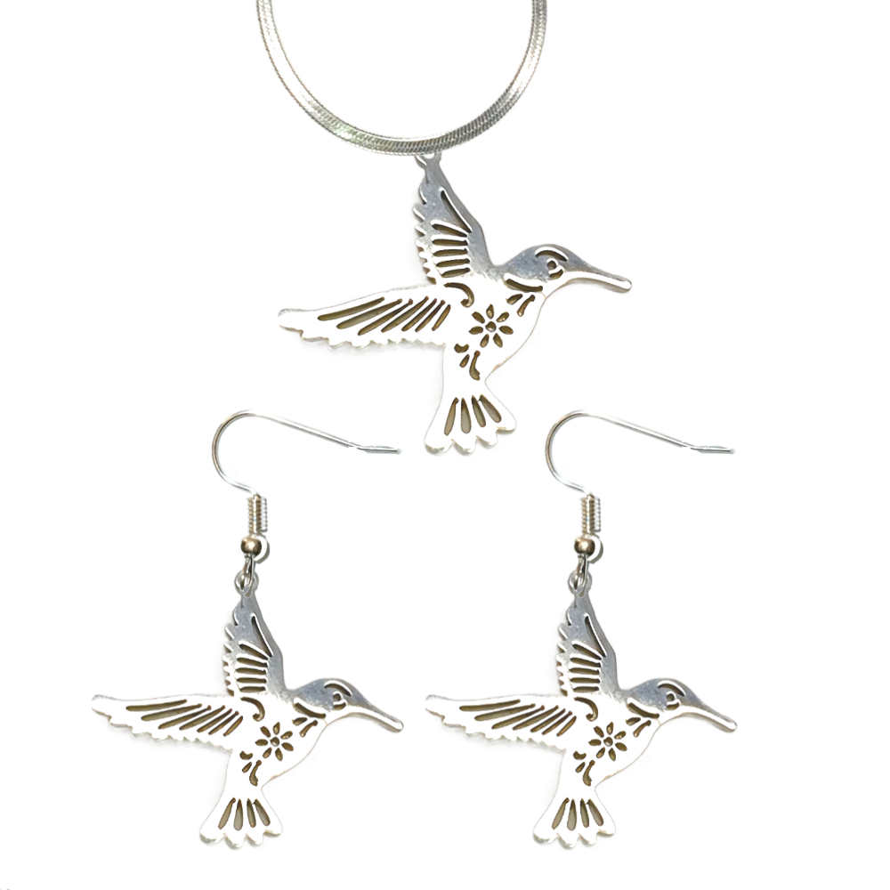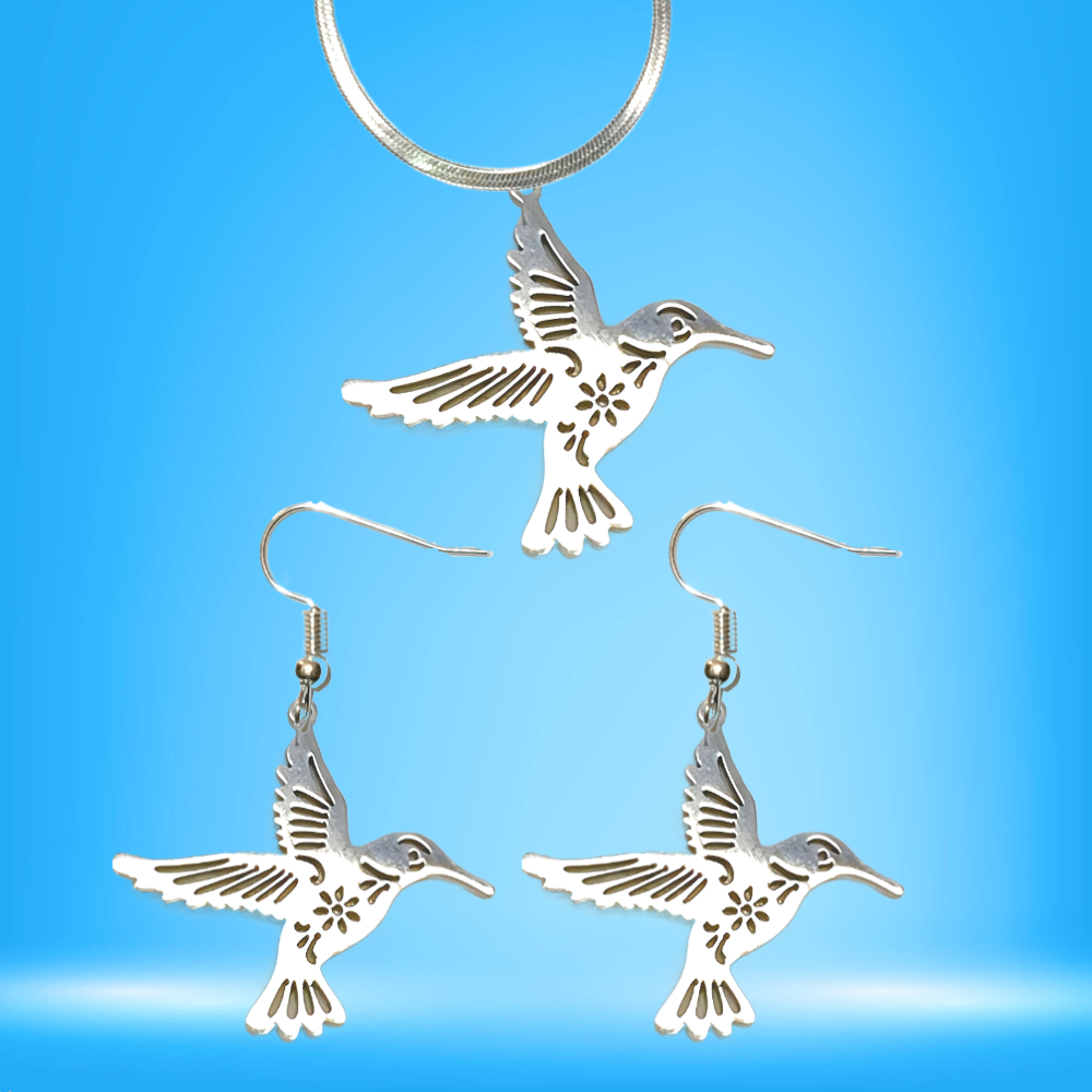 ******1 Juego (Aretes y Dije en Collar) de Hermoso Colibr Detallado Grande M3 40x35mm Acero Color Plata Acero Alta Durabilidad