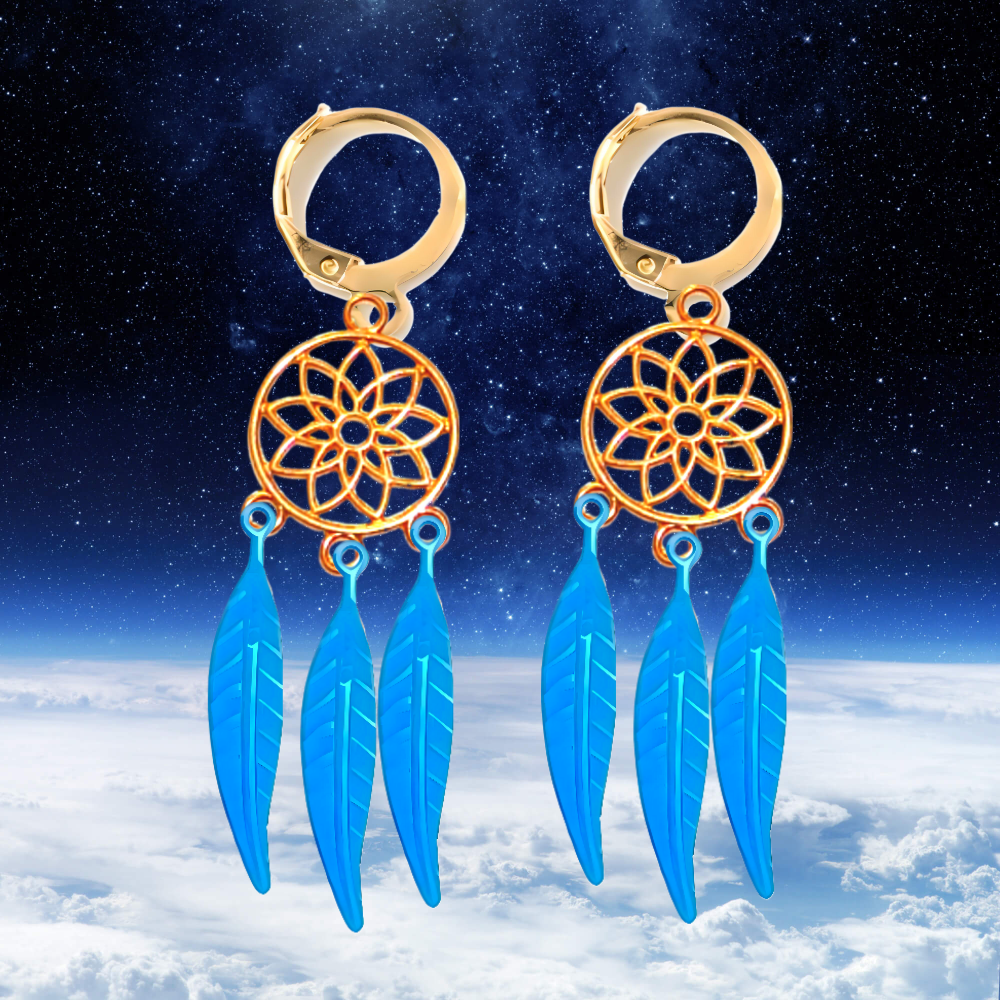 ******1 Par de Atrapasueños 30x15mm Color Dorado + Plumas Acero Color Azul en Arracaditas Doradas Acero 12x1mm  Acero Alta Durabilidad  *****
