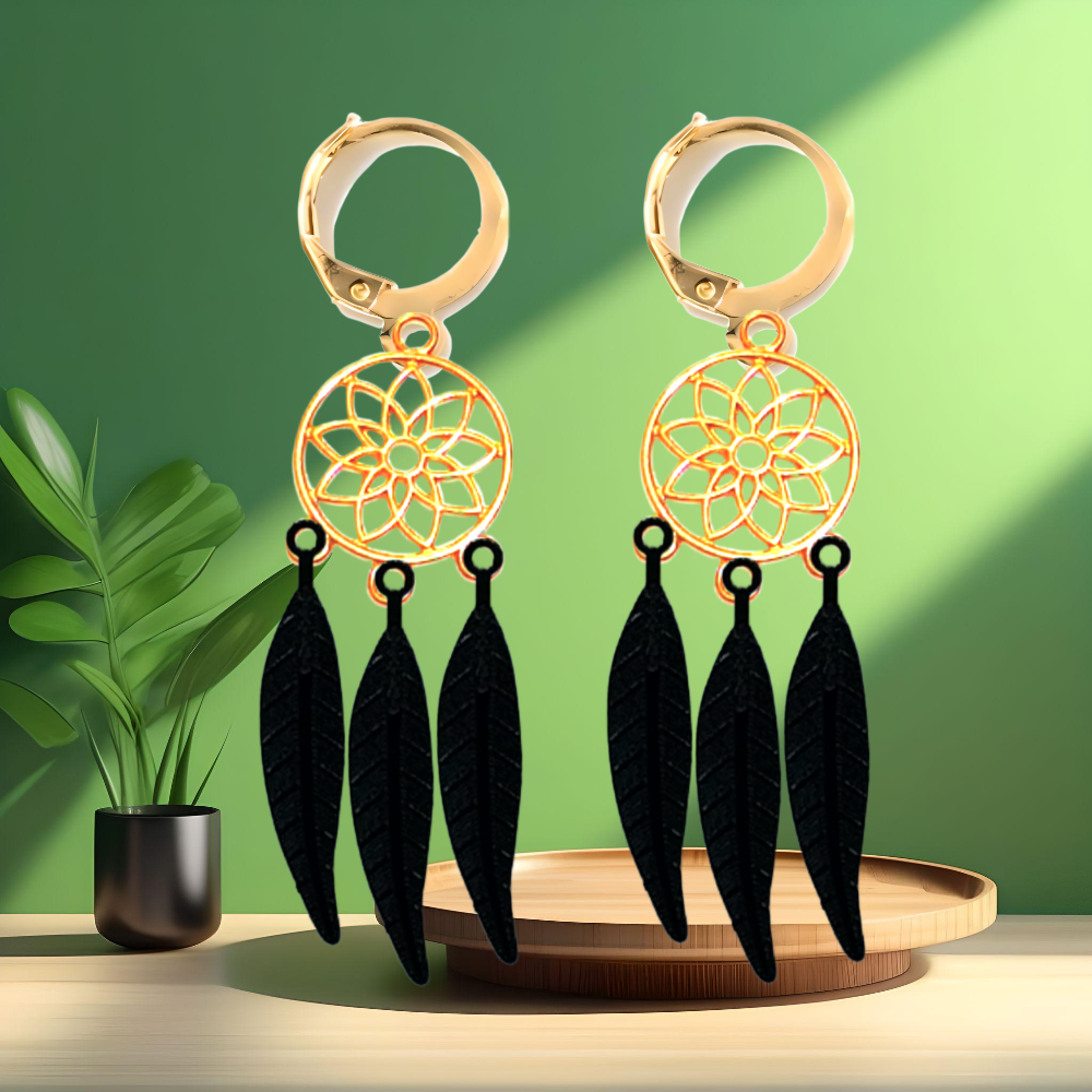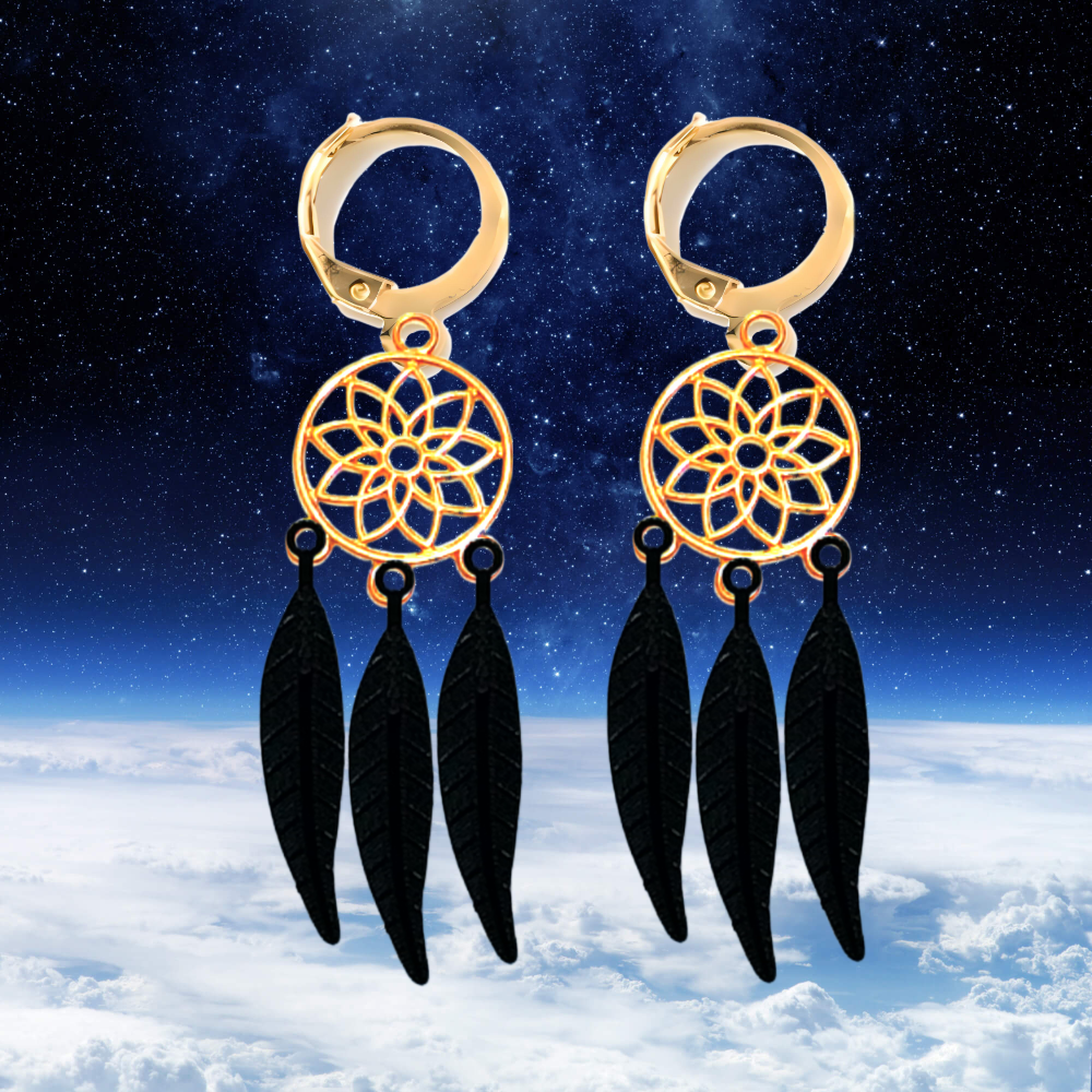******1 Par de Atrapasueños 30x15mm Color Dorado + Plumas Acero Color Negro en Arracaditas Doradas Acero 12x1mm  Acero Alta Durabilidad  *****