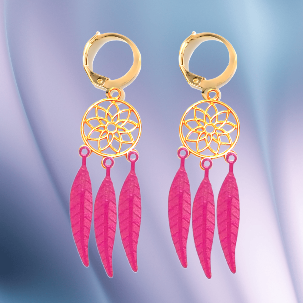 ******1 Par de Atrapasueños 30x15mm Color Dorado + Plumas Acero Color Rosa en Arracaditas Doradas Acero 12x1mm  Acero Alta Durabilidad  *****