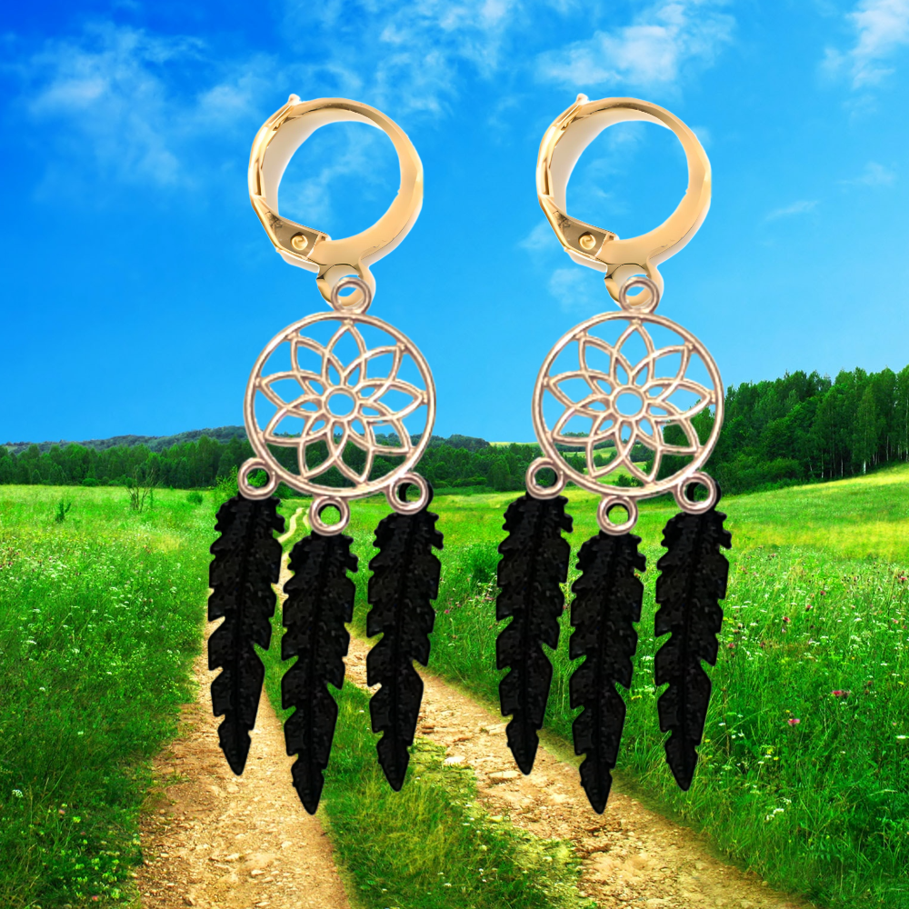 ****** 1 Par de Atrapasueños 30x15mm Color Plata + Plumas Medianas Etnicas Color Negro Arracaditas Doradas Acero 12x1mm  Acero Alta Durabilidad  *****