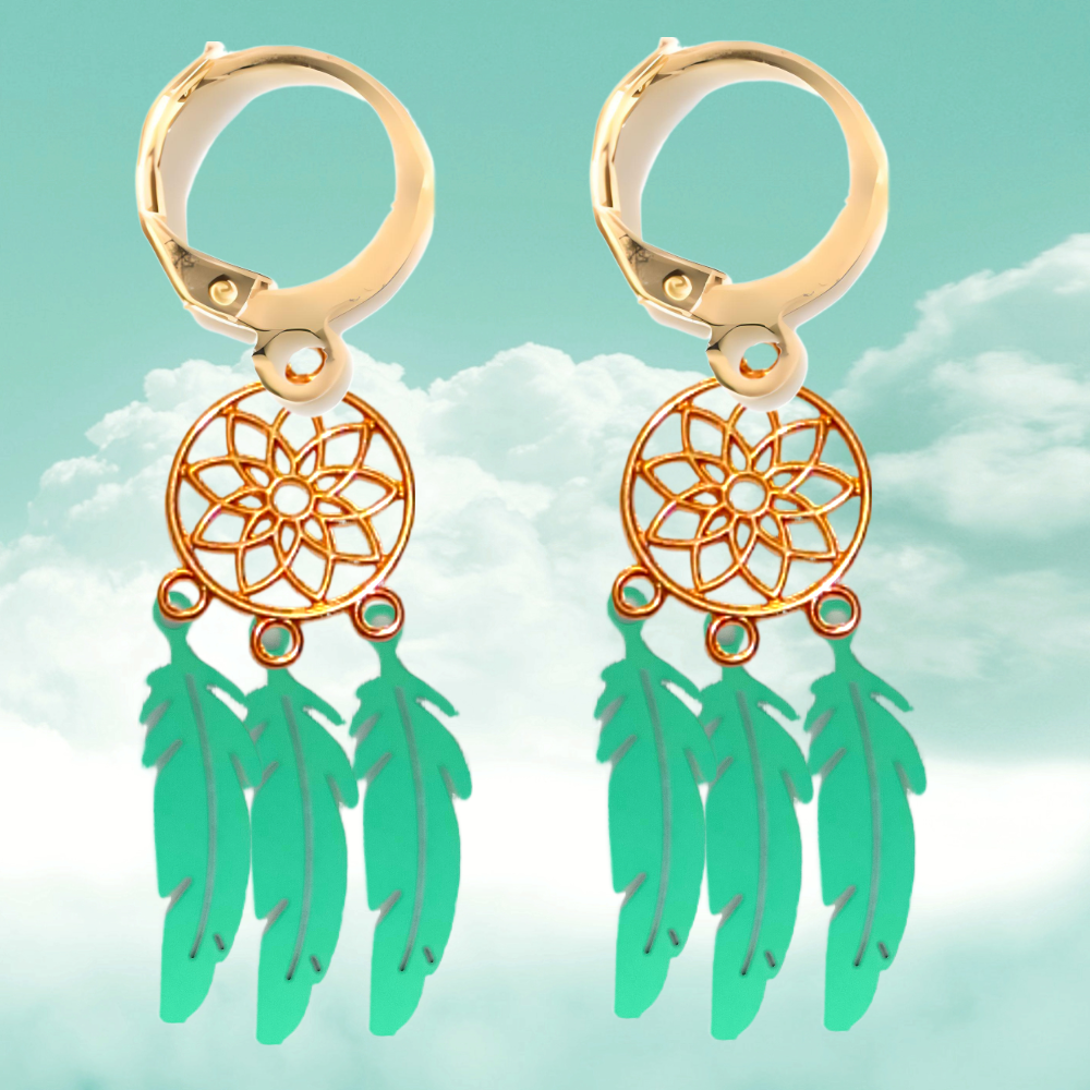 ******1 Par de Atrapasueños 30x15mm Color Dorado + Plumas Acero Color Verde en Arracaditas Doradas Acero 12x1mm  Acero Alta Durabilidad  *****