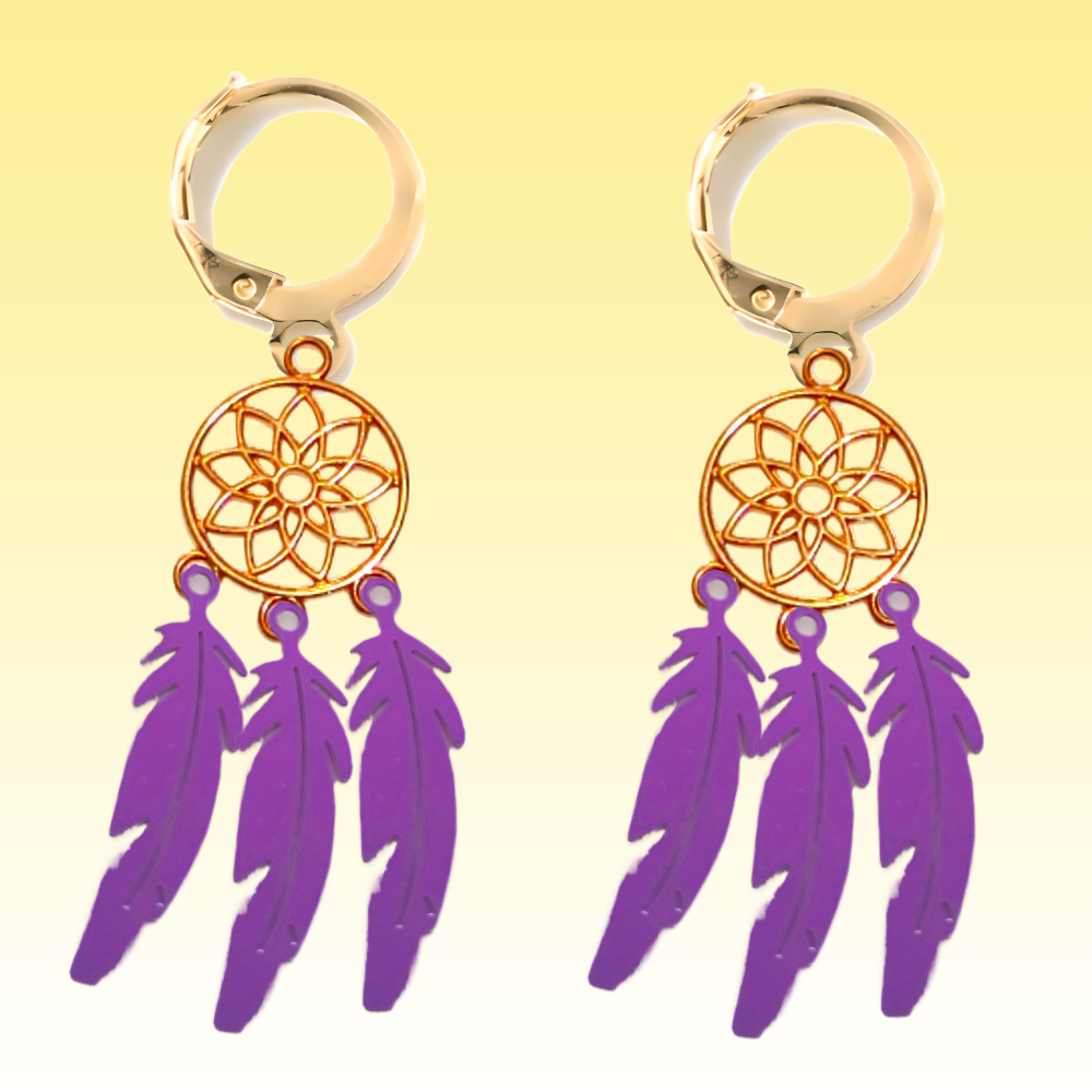 ******1 Par de Atrapasueños 30x15mm Color Dorado + Plumas Acero Color Morado en Arracaditas Doradas Acero 12x1mm  Acero Alta Durabilidad  *****
