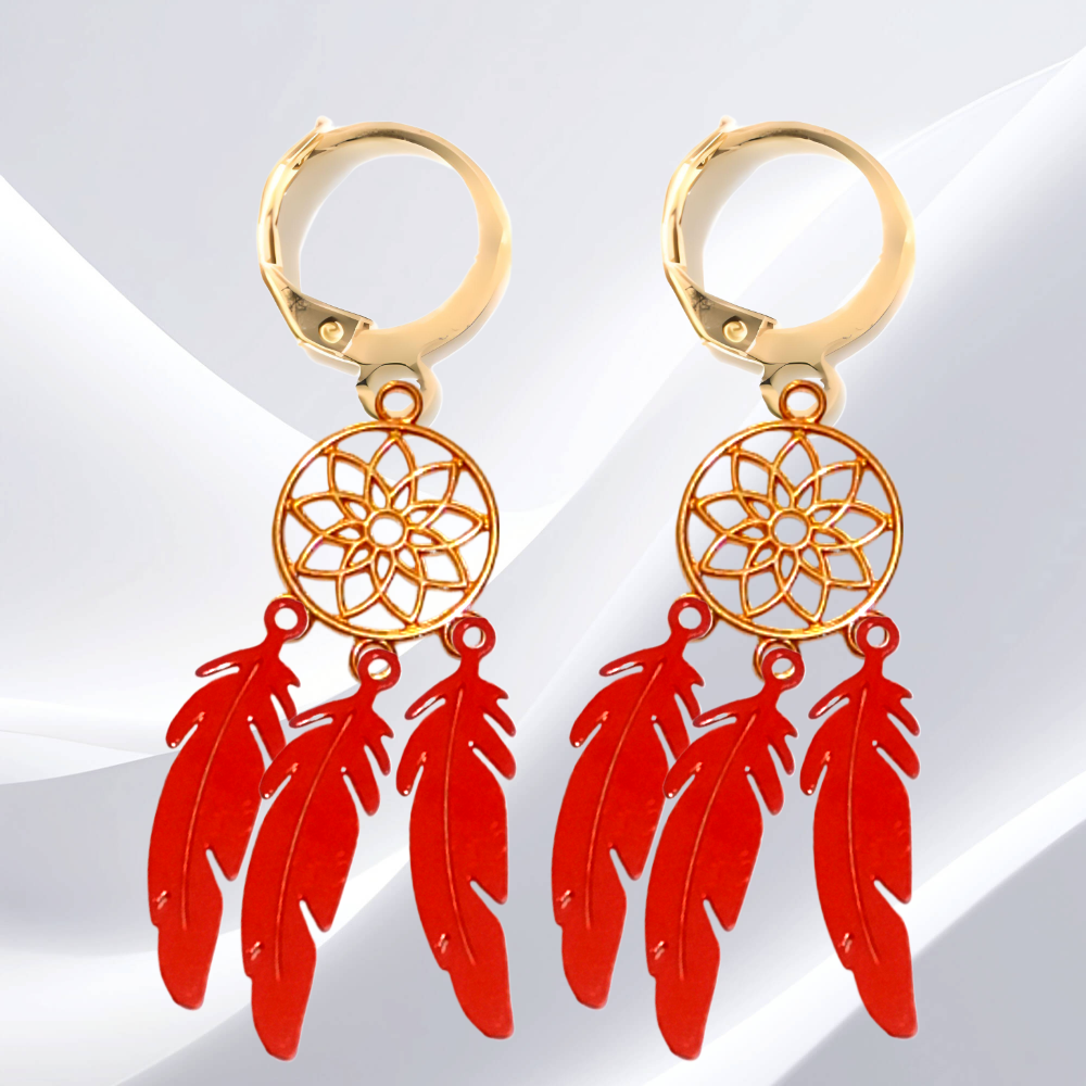 ******1 Par de Atrapasueños 30x15mm Color Dorado + Plumas Acero Color Rojo Intenso en Arracaditas Doradas Acero 12x1mm  Acero Alta Durabilidad  *****