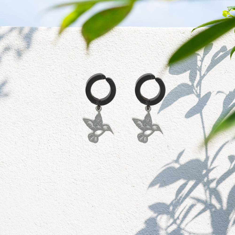 ******1 Par Colibries 3D 20x13mm en Aretes Falsos / Arracadas Falsas Negras Acero 14x4mm Acero Alta Durabilidad *****