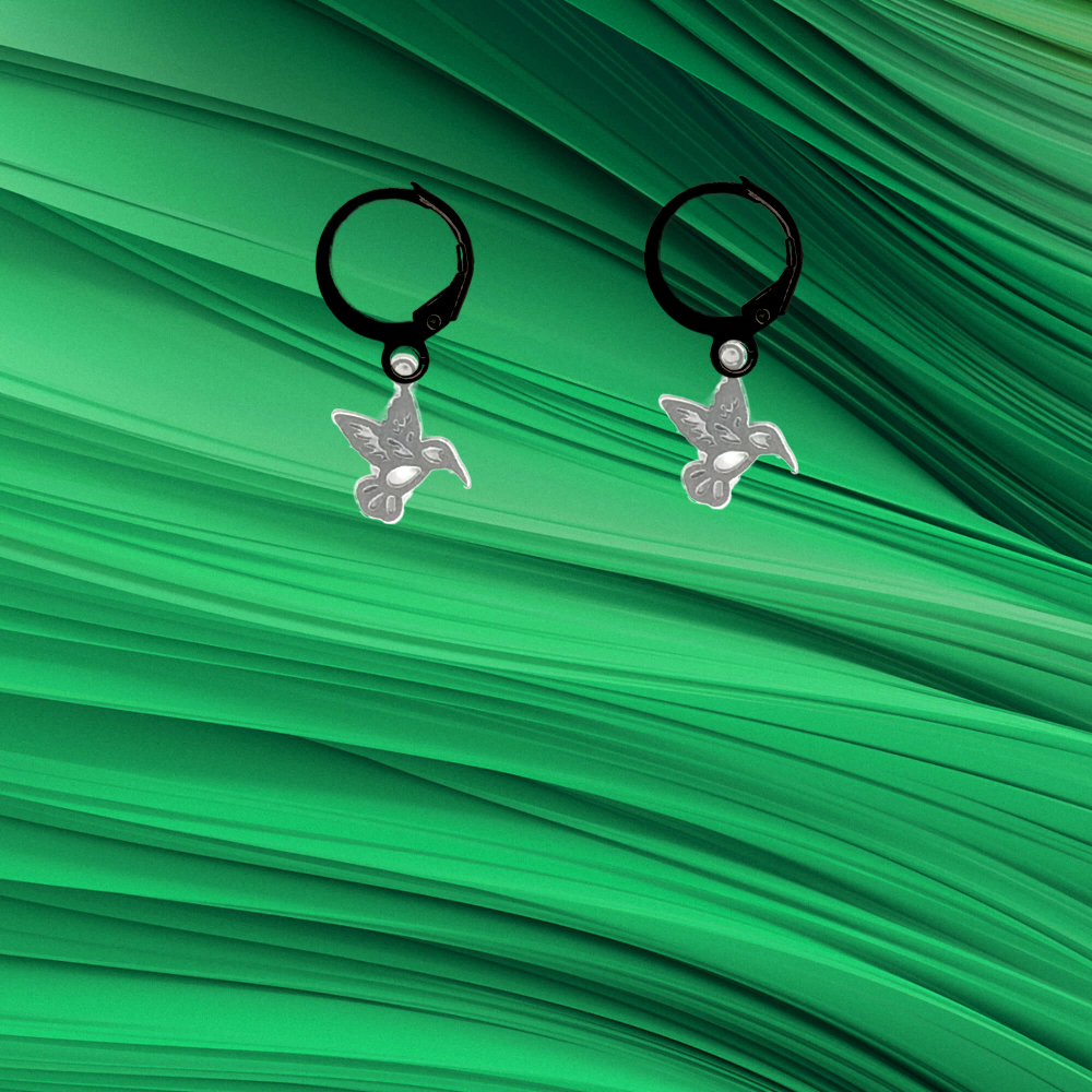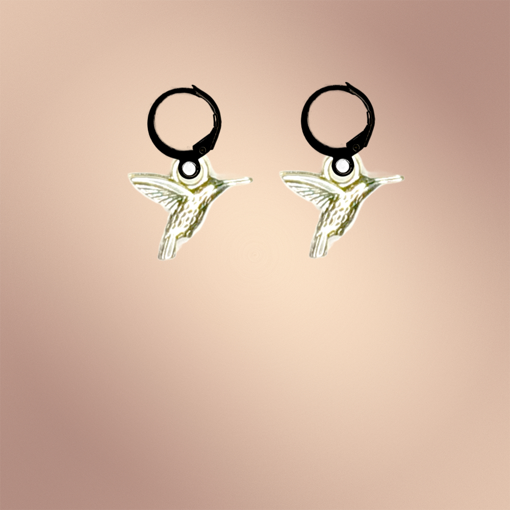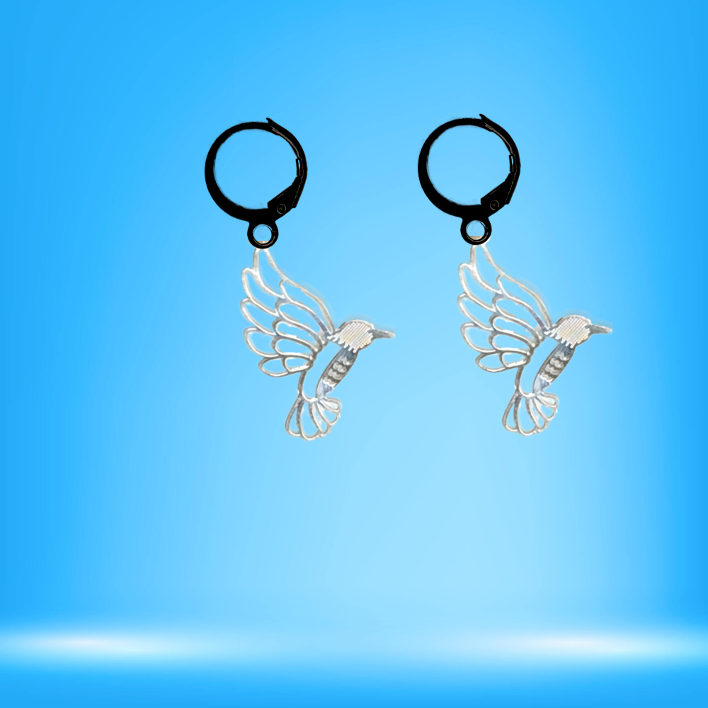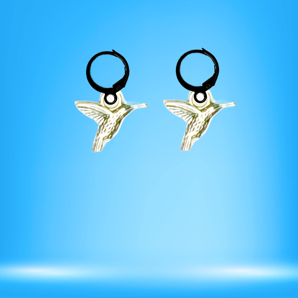 ******1 Par Colibries Grandes Color Pl,ata 35x30mm en Arracaditas Negras Acero 12x1mm  Acero Alta Durabilidad  *****