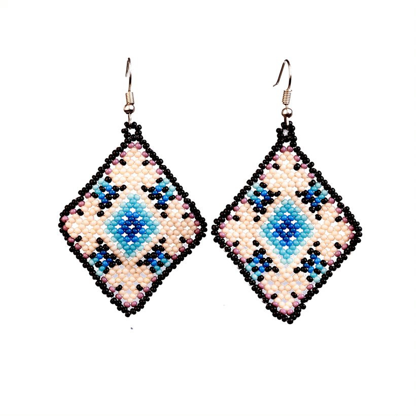 Par de aretes en tonos azulados elaborados de chaquira. Pieza tejida por la maestra Wixárika, Silvia Evangelista Muñoz, creada con chaquira, sustituto de semillas, conchas y piedras que utilizaban antiguamente. Los elementos de su diseño nos muestran el amor a la naturaleza, en un diálogo de respeto a la tierra, que este pueblo practica.