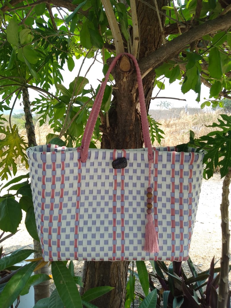 Bolso elaborado en material de toquilla, tejida con tonos en color lila, rosa y blanco, con asas de tejidas y decorado al frente.
