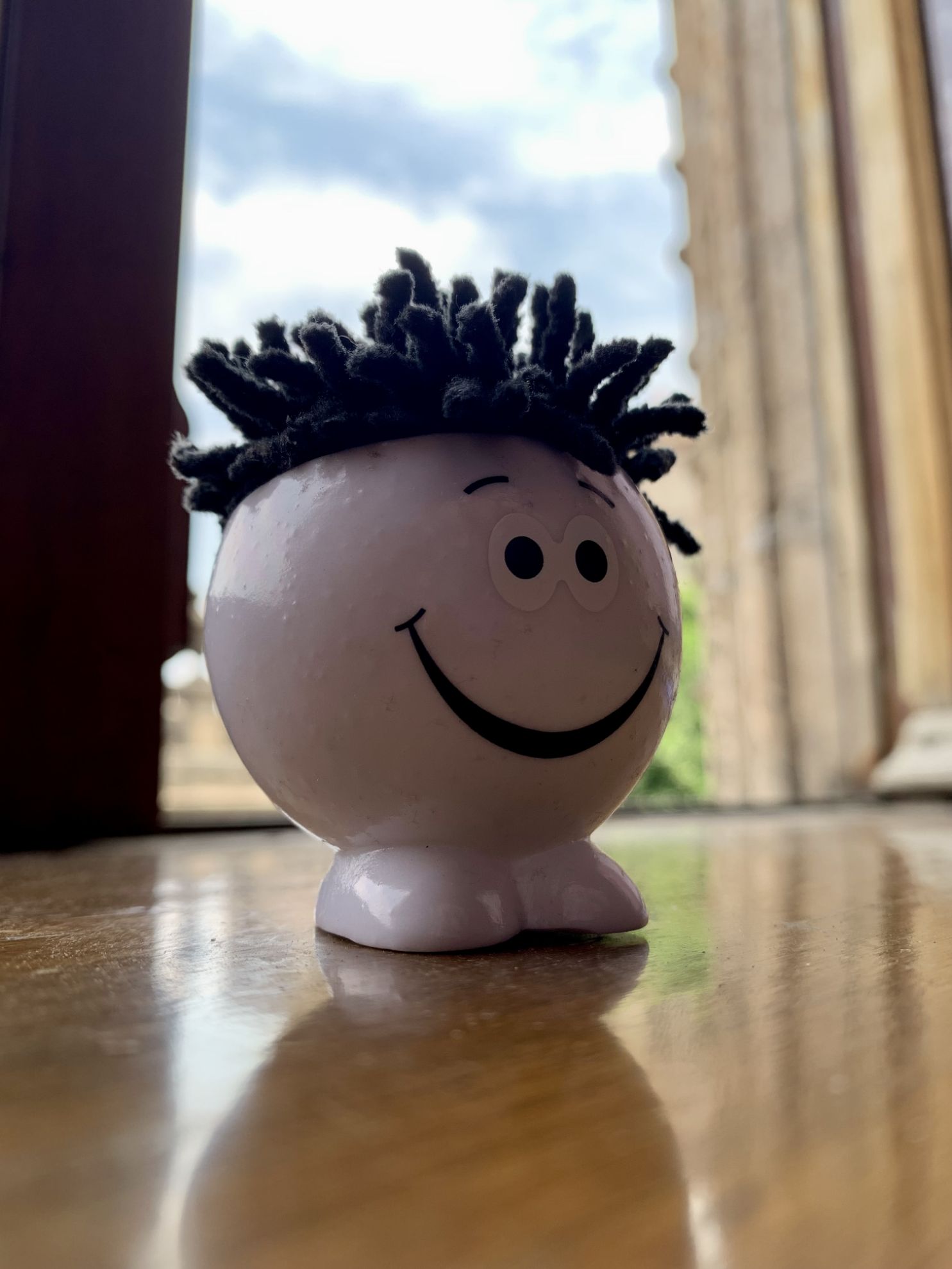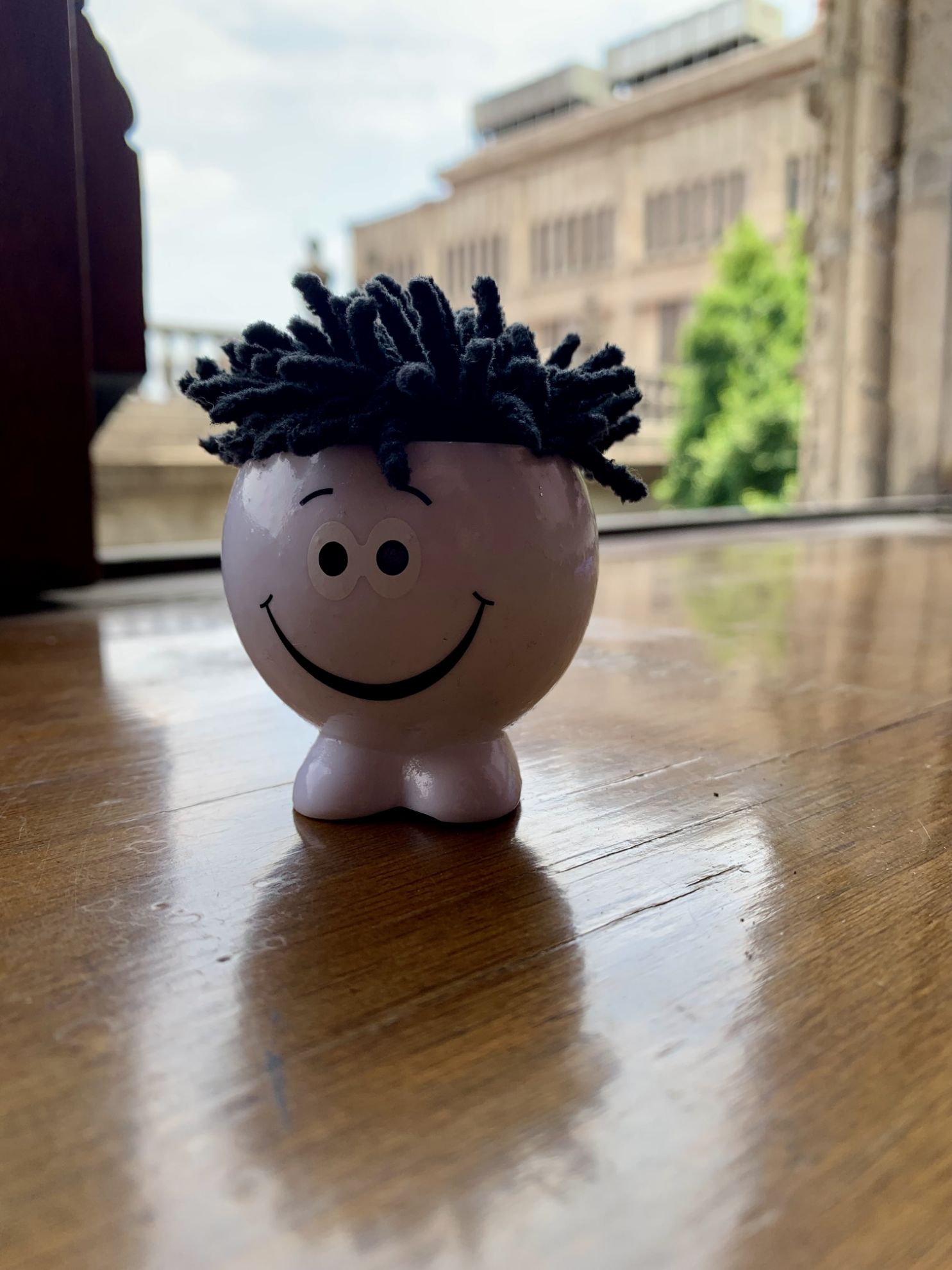 Muñecos con cabello de microfibra estampados con el logo de Palacio Postal y una carita feliz.