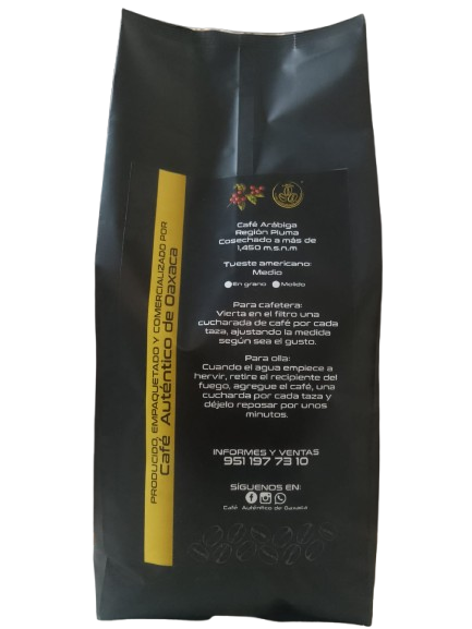 GRANO ARABIGA, VARIEDAD TYPICA Y BOURBON, TUESTE MEDIO, EQUILIBRIO ENTRE SABOR, AROMA Y ACIDEZ, DESPRENDIMIENTOS AROMATICOS A CHOCOLATE Y FRUTOS SECOS, CAFE CON 83 PUNTOS EN TAZA DE ACUERDO A LA SCA (SPECIALTY COFFEE ASSOCIATION) Y CON CERTIFICACIÓN DE HECHO EN OAXACA LO QUE GARANTIZA QUE NUESTRO CAFÉ ES COSECHADO EN TERRITORIO OAXAQUEÑO Y 100% ORGÁNICO EN UN PROCESO AMIGABLE CON EL MEDIO AMBIENTE.