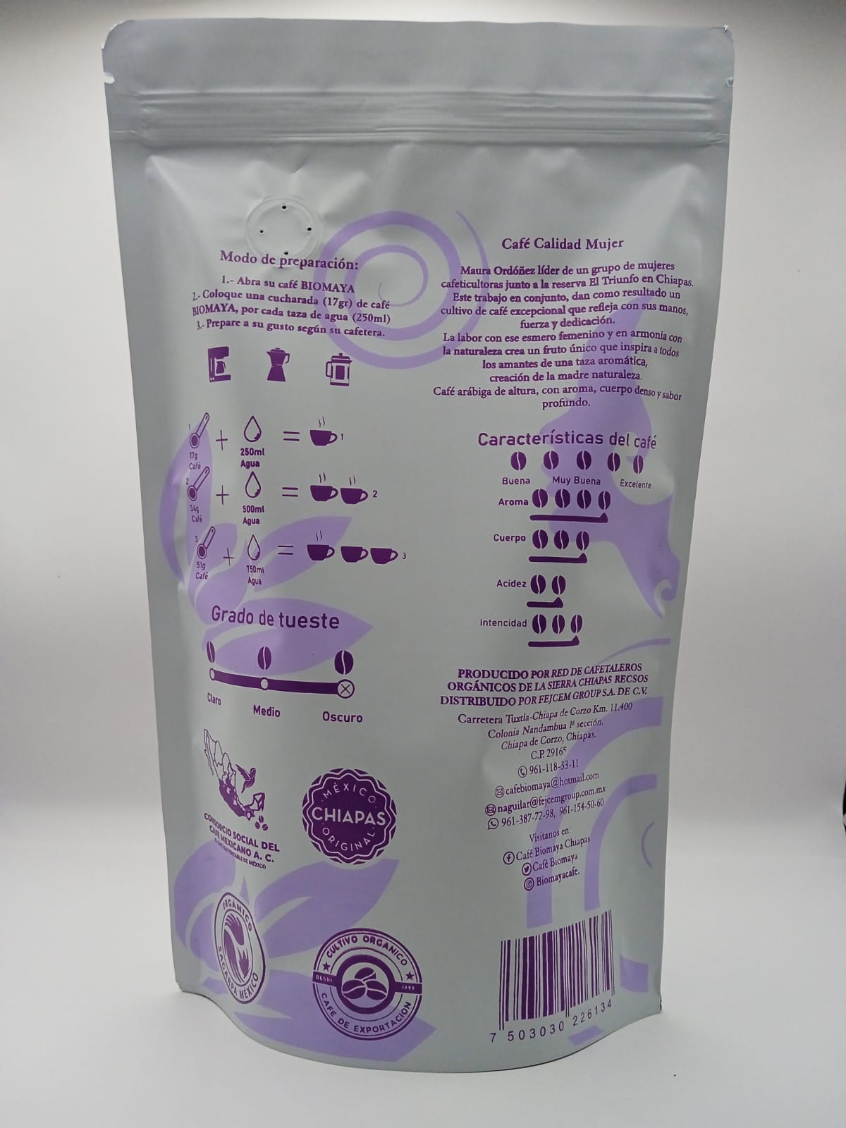 Café Biomaya Calidad Mujer: Es la cosecha de mujeres que se dedican a la cafeticultura y que han quedado al frente del cultivo de los cafetales y que con esa actividad llevan el sustento a sus hogares, café rábiga de la región sierra del estado de Chiapas, café de altura con aroma, cuerpo y acidez equilibrado.