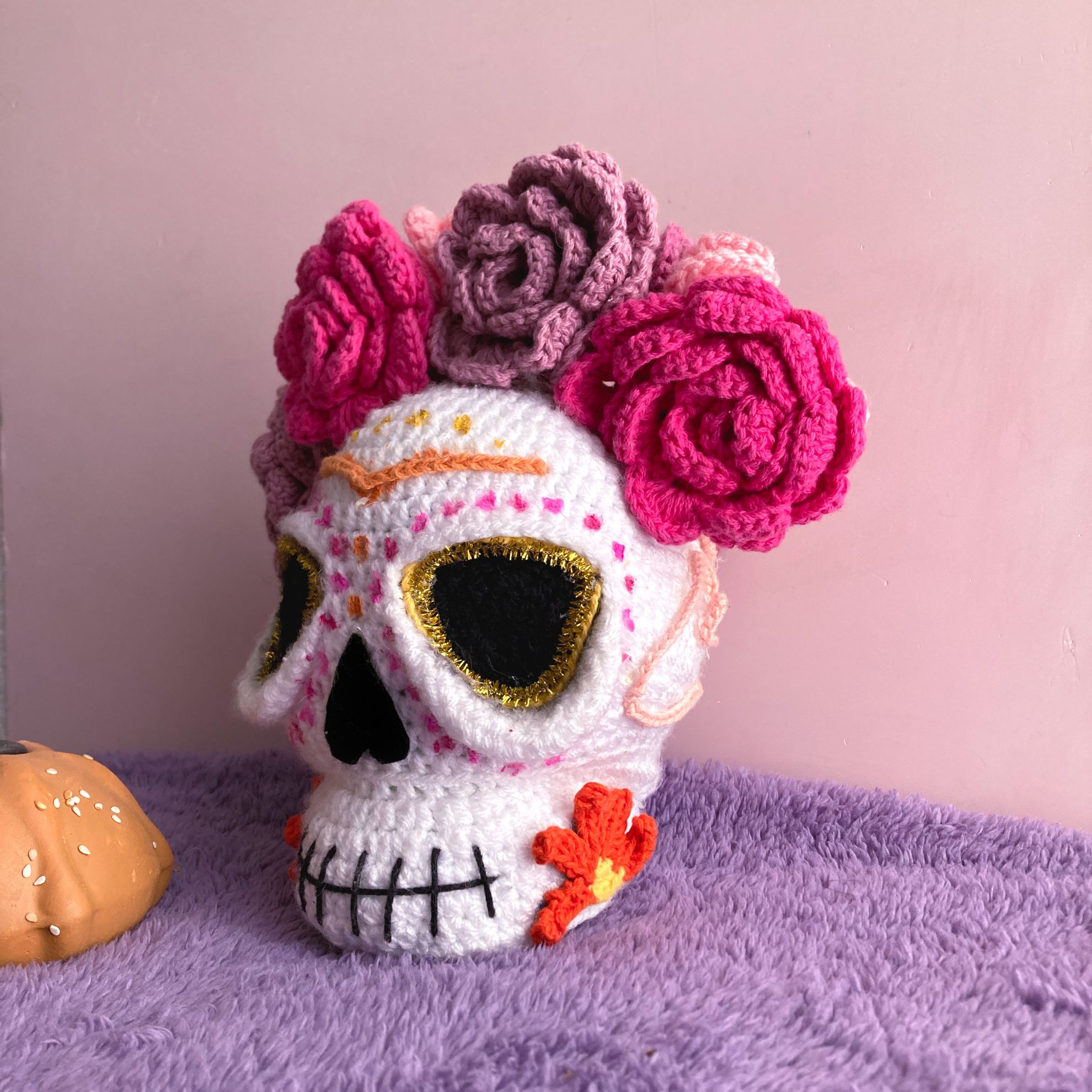 Una pieza única que celebra el Día de Muertos. Cada detalle de esta calavera tejida a mano, de 30 cm de altura, fue creado con dedicación durante 4 semanas. Inspirada en las flores de los altares después del 2 de noviembre.