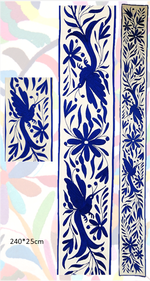 Camino de mesa confeccionado en manta cruda de algodón, con terminado en bies rey bordado a mano con tenangos. Mide 240*25. bordado en colo AZUL REY.